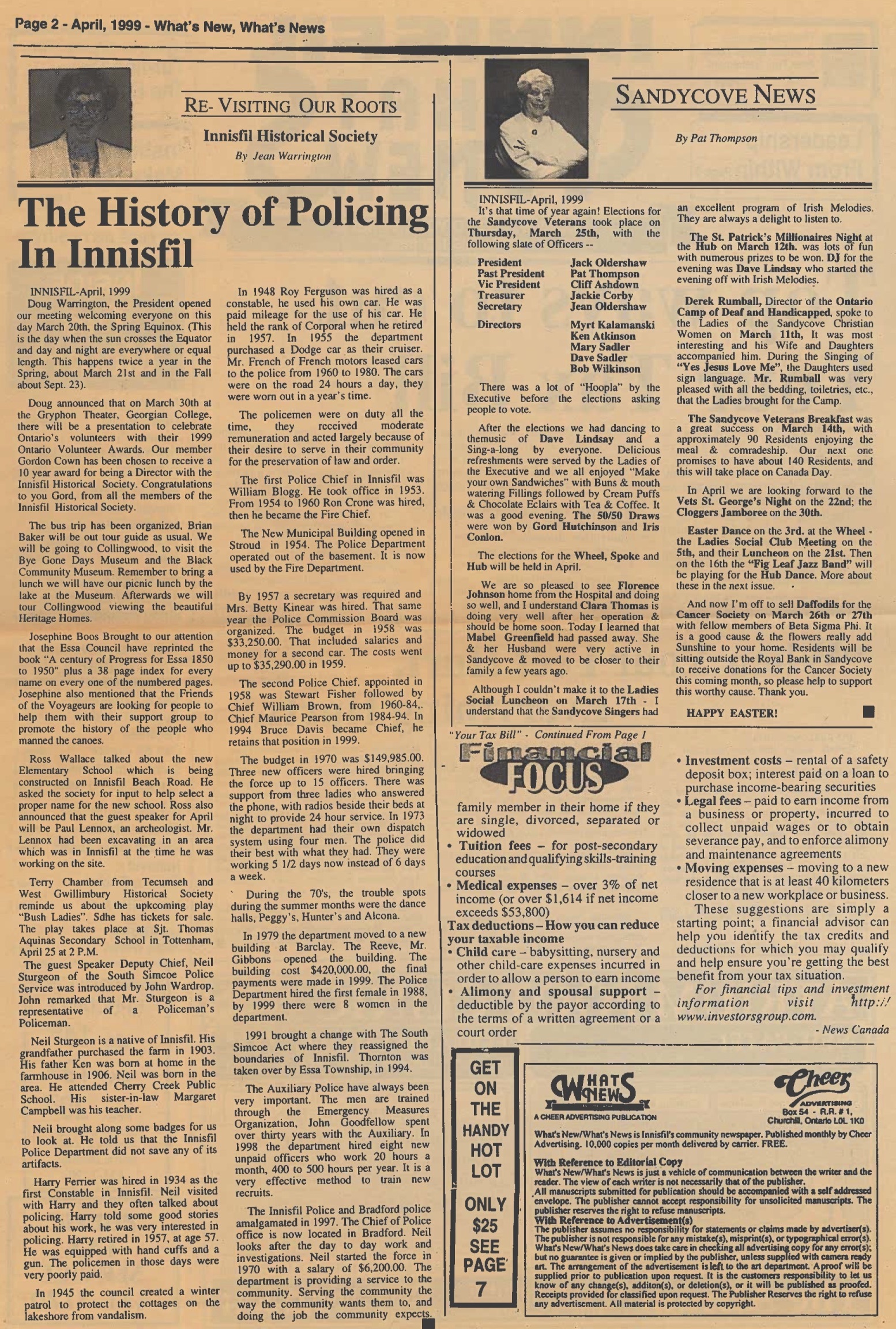 Article submitted to "Innisfil Whats New" newspaper, by Jean Warrington from Innisfil Historical Society. The article discusses Ontario Volunteer Awards at the Gryphon Theatre, Georgian College, a day trip to Collingwood with Brian Baker as the tour guide, a new elementary school being built on Innisfil Beach Road, and the history of policing in Innisfil.