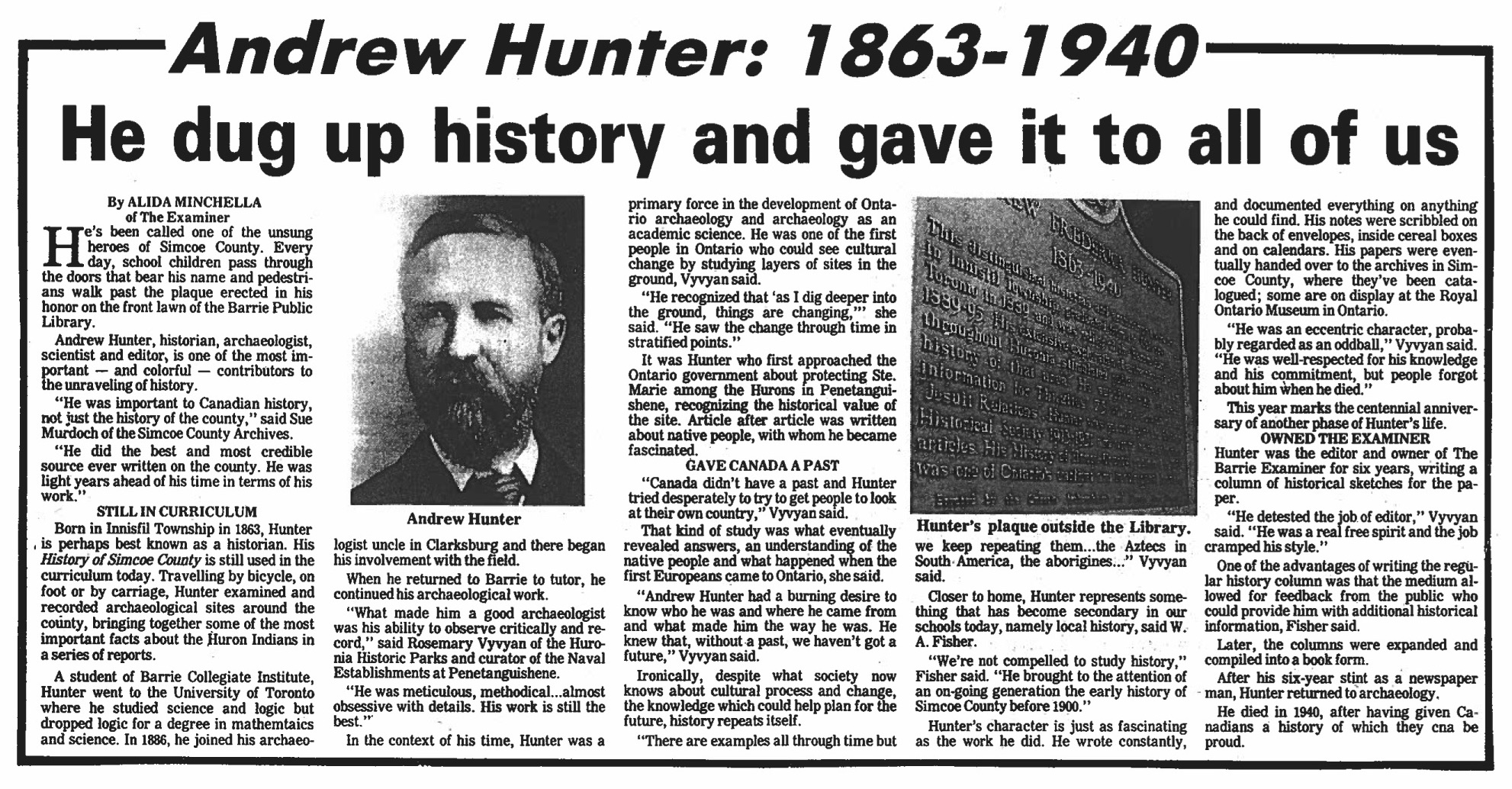 Newspaper article written by Alida Minchella, of The Examiner, with accompanying images. The article discusses Andrew Hunter (1863-1940), a historian, archaeologist, scientist and editor, who was important to Simcoe County and Canadian history. Poor resolution is due to the acquisition being a photocopy, if you have an original copy of this document please contact the library.