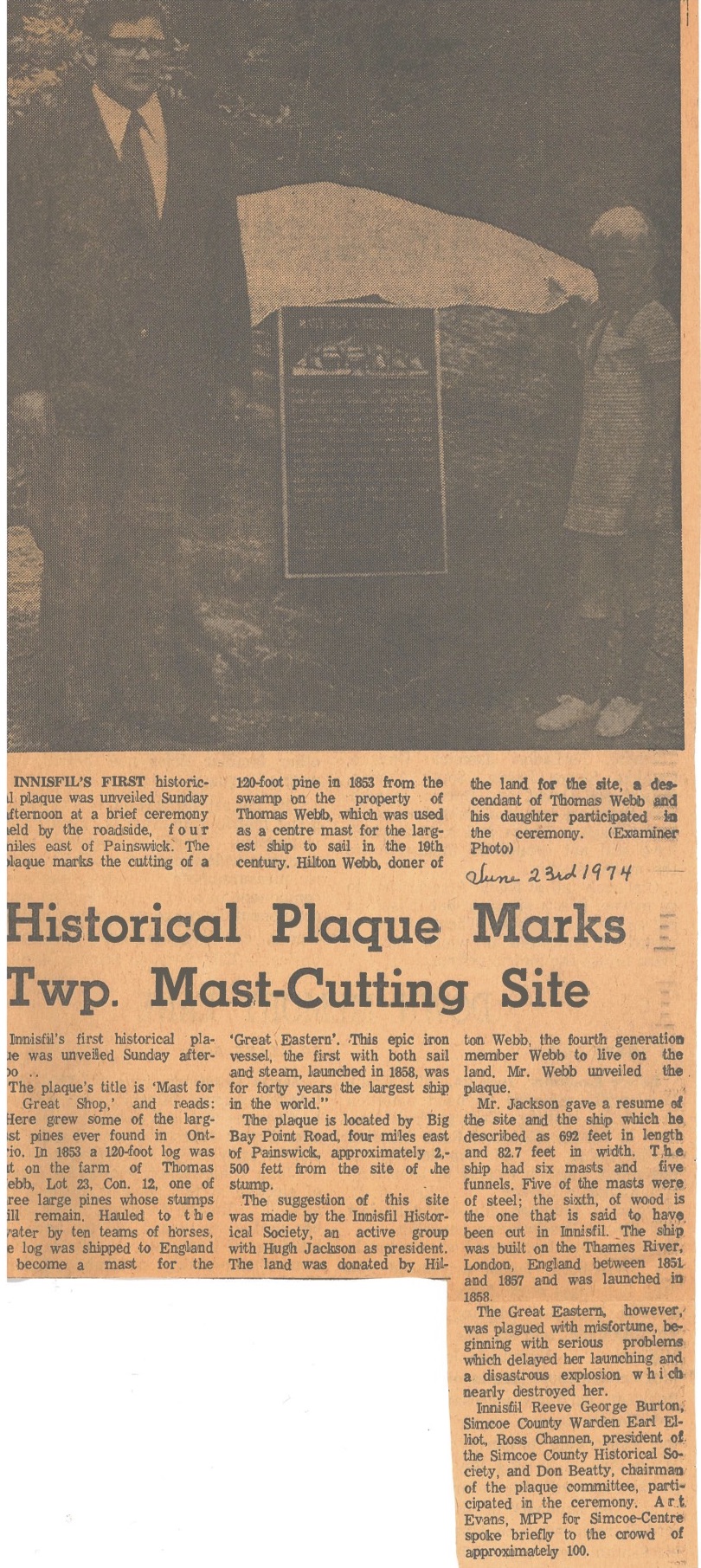 Newspaper clipping of an article about the first historical plaque in Innisfil, unveiled Sunday June 23rd at 2:30pm. Caption under the image reads "Innisfil's first historical plaque was unveiled Sunday afternoon at a brief ceremony held by the roadside, four miles east of Painswick. The plaque marks the cutting of a 120-foot pine in 1853 from the swamp on the property of Thomas Webb, which was used as a centre mast for the largest ship to sail in the 19th century. Hilton Webb, doner of the land for the site, a descendant of Thomas Webb and his daughter participated in the ceremony. (Examiner Photo)"