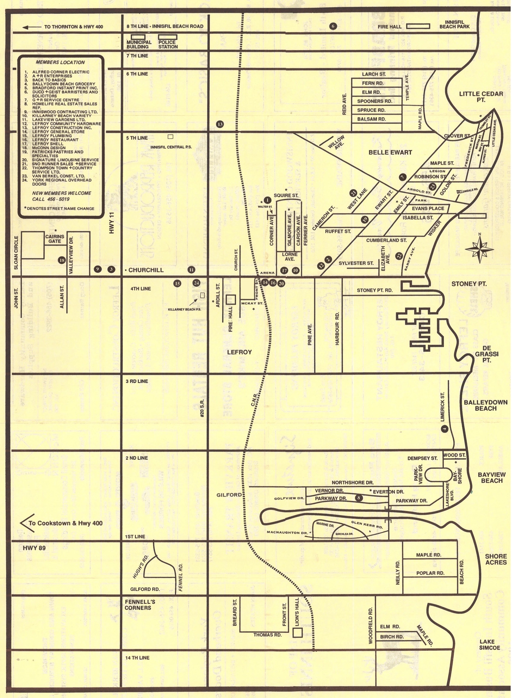Map of South Innisfil, courtesy of South Innisfil Business Community Association 1990. The map shows 8th Line (Innisfil Beach Road) south to 14th Line (just below Fennell's Corner), showing the shorefront of Innisfil on Lake Simcoe.