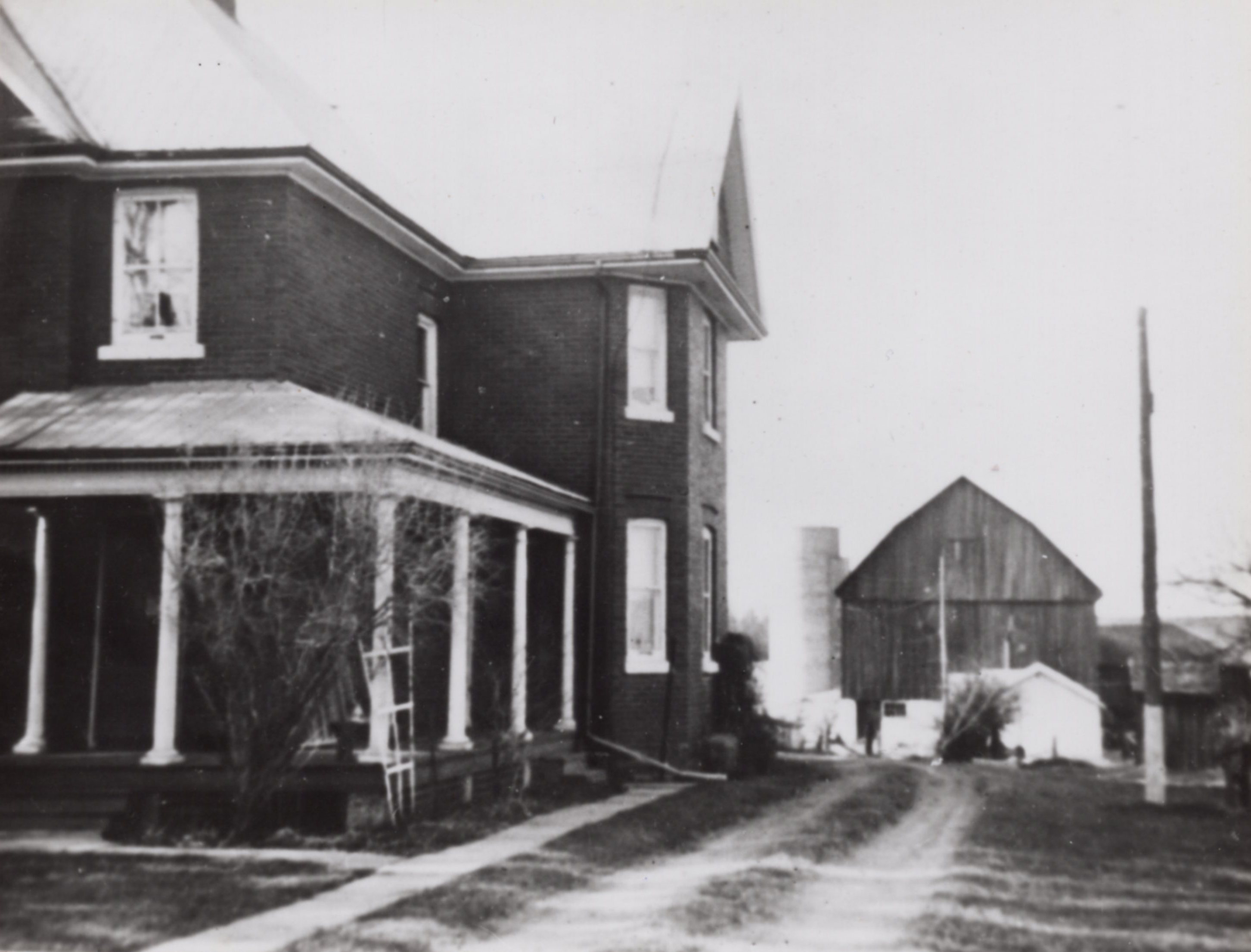 Image taken from 'The History of Two Pioneer Families and The Farm at S.H. Lot 19, Con. 5. Innisfil Township, Simcoe County'. View of the farm buildings in 1959. The image shows the side of the farm house, and in the background a farm and silo can be seen.