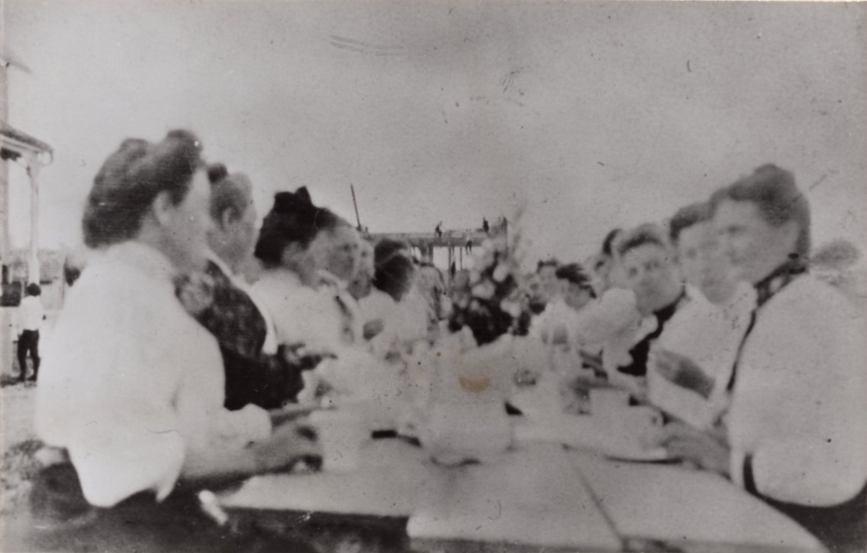 Image taken from 'The History of Two Pioneer Families and The Farm at S.H. Lot 19, Con. 5. Innisfil Township, Simcoe County'. The one hundred women and girls having lunch before serving the two hundred men and boys who attended the barn raising. The barn raising is in progress in the background. Mrs. Stewart is second on left of picture."