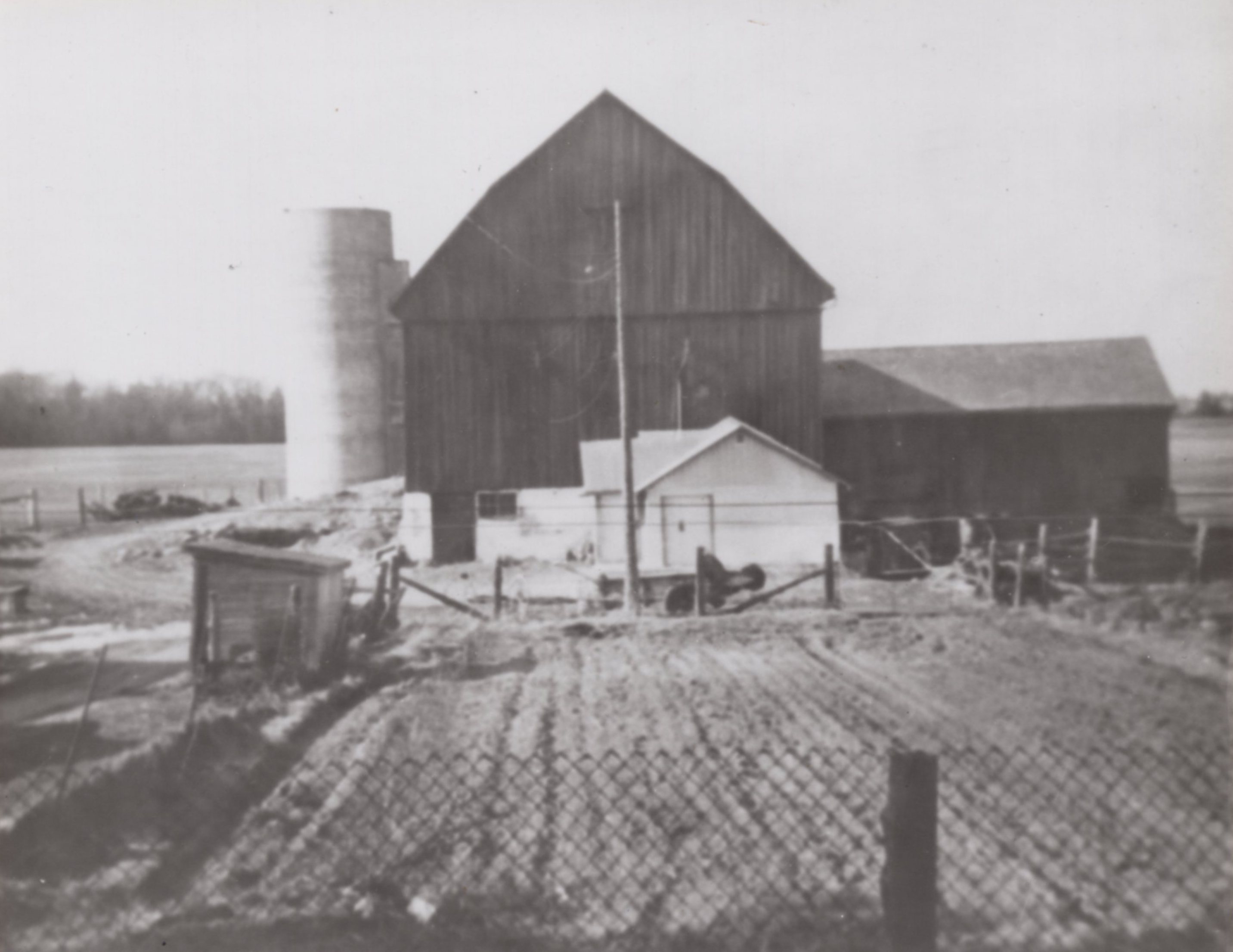 Image taken from 'The History of Two Pioneer Families and The Farm at S.H. Lot 19, Con. 5. Innisfil Township, Simcoe County'. The photograph shows a farm barn and a silo in the background, in the foreground is the farm's vegetable garden.