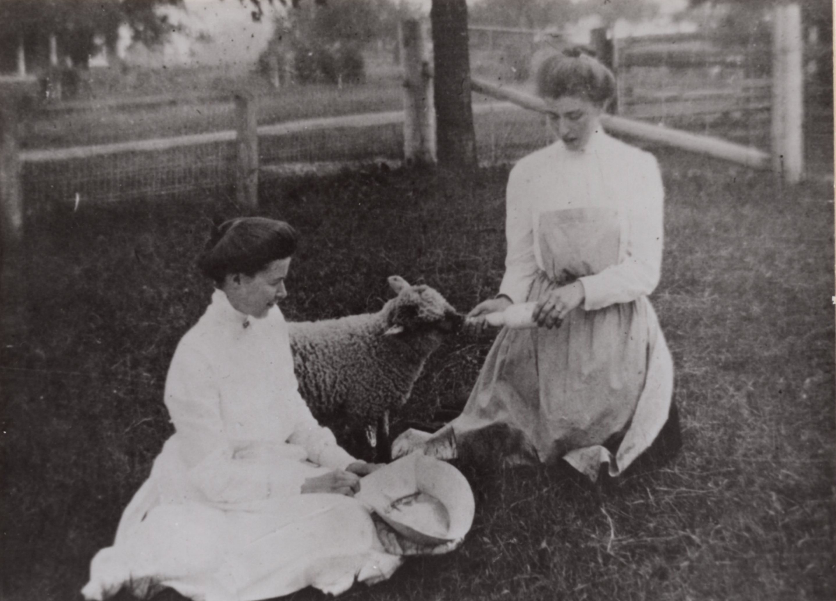 Image taken from 'The History of Two Pioneer Families and The Farm at S.H. Lot 19, Con. 5. Innisfil Township, Simcoe County'. Mabel and Millie, the two daughters of Robert and Mrs. Stewart. It was not uncommon to see a pet lamb on a farm where sheep were being raised. Frequently a mother ewe would disown her strong healthy lamb and as a last resort some member of the family would volunteer to raise the lamb on cow's milk as shown in this picture. As the pet lamb matured it usually became quite a nuisance and was turned in with the farm flock. It was amazing to see how quickly the pet lamb learned to steal its meals from an ewe that was raising a single lamb.