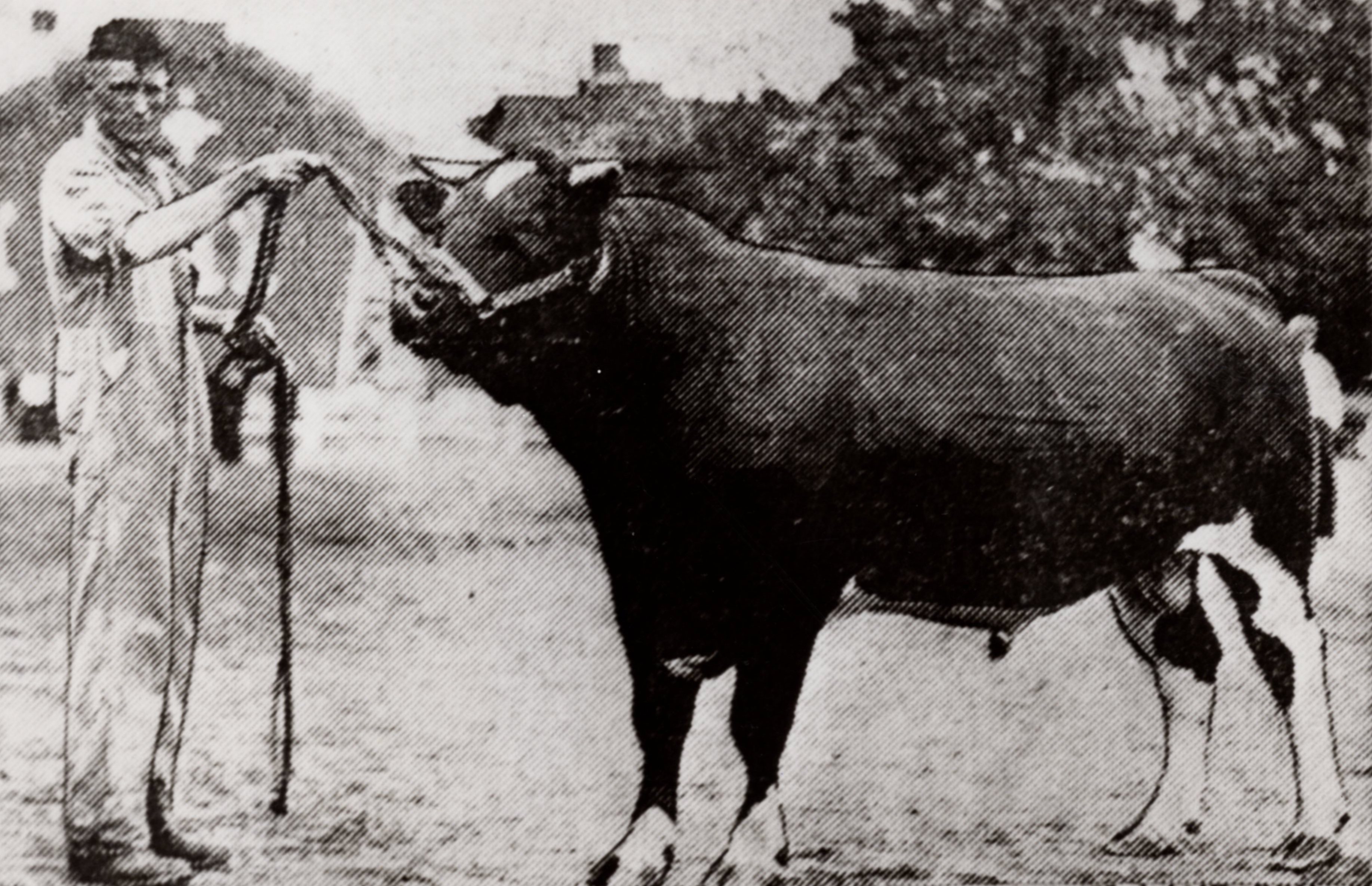 Image taken from 'The History of Two Pioneer Families and The Farm at S.H. Lot 19, Con. 5. Innisfil Township, Simcoe County'. "Sir Pluto Jasmine" a Holstein bull weighing over one ton and judged the best bull of all dairy breeds exhibited. It is owned by H.M. Stewart, of Lefroy. Clarence Stewart at the halter.