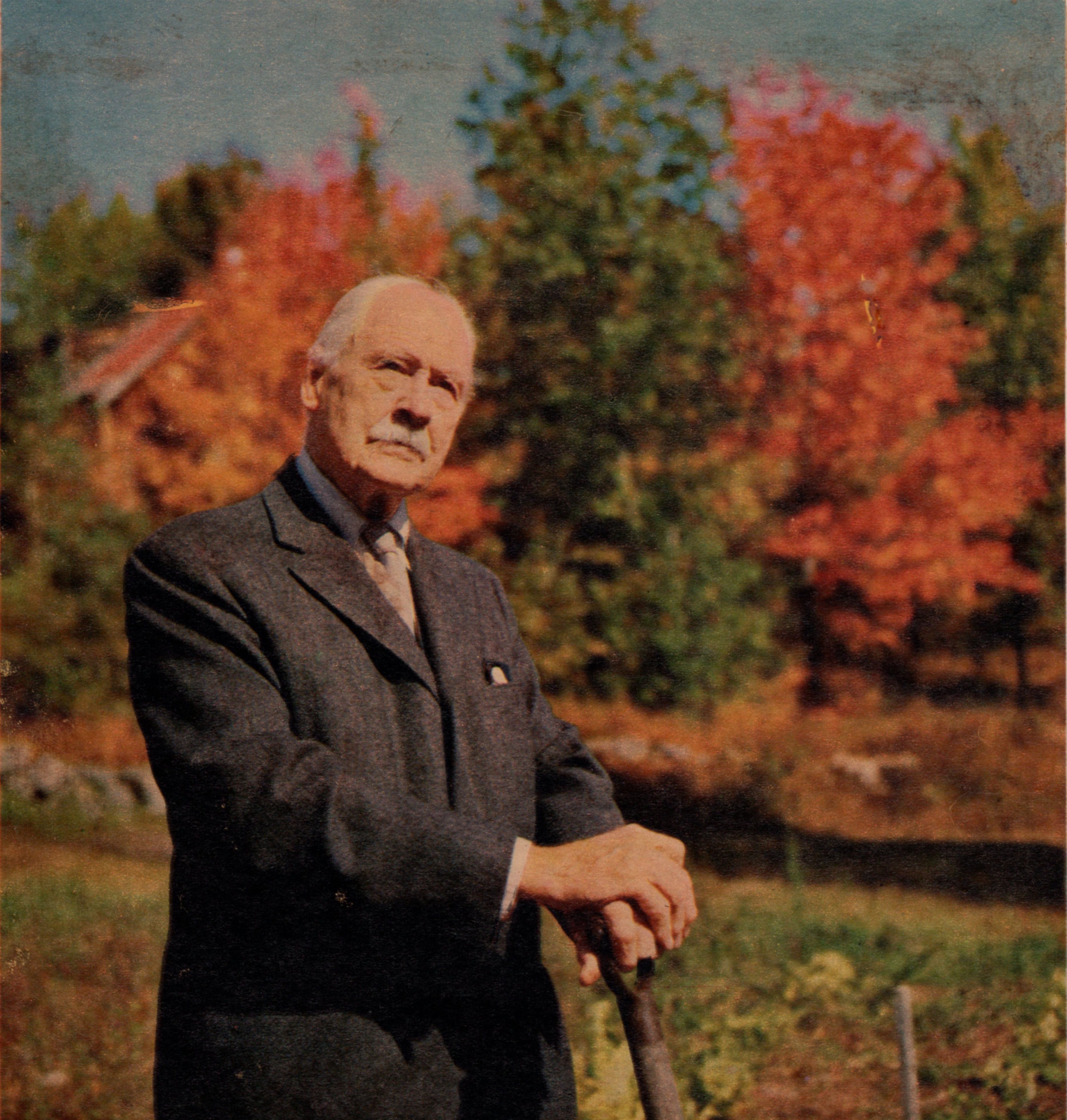 Image taken from 'The History of Two Pioneer Families and The Farm at S.H. Lot 19, Con. 5. Innisfil Township, Simcoe County'. The colour image is a newspaper clipping, presumably from "Family Herald", 3/14/63 - leaning on his digging fork, philosopher-farmer Hocking surveys hie New Hampshire acres.