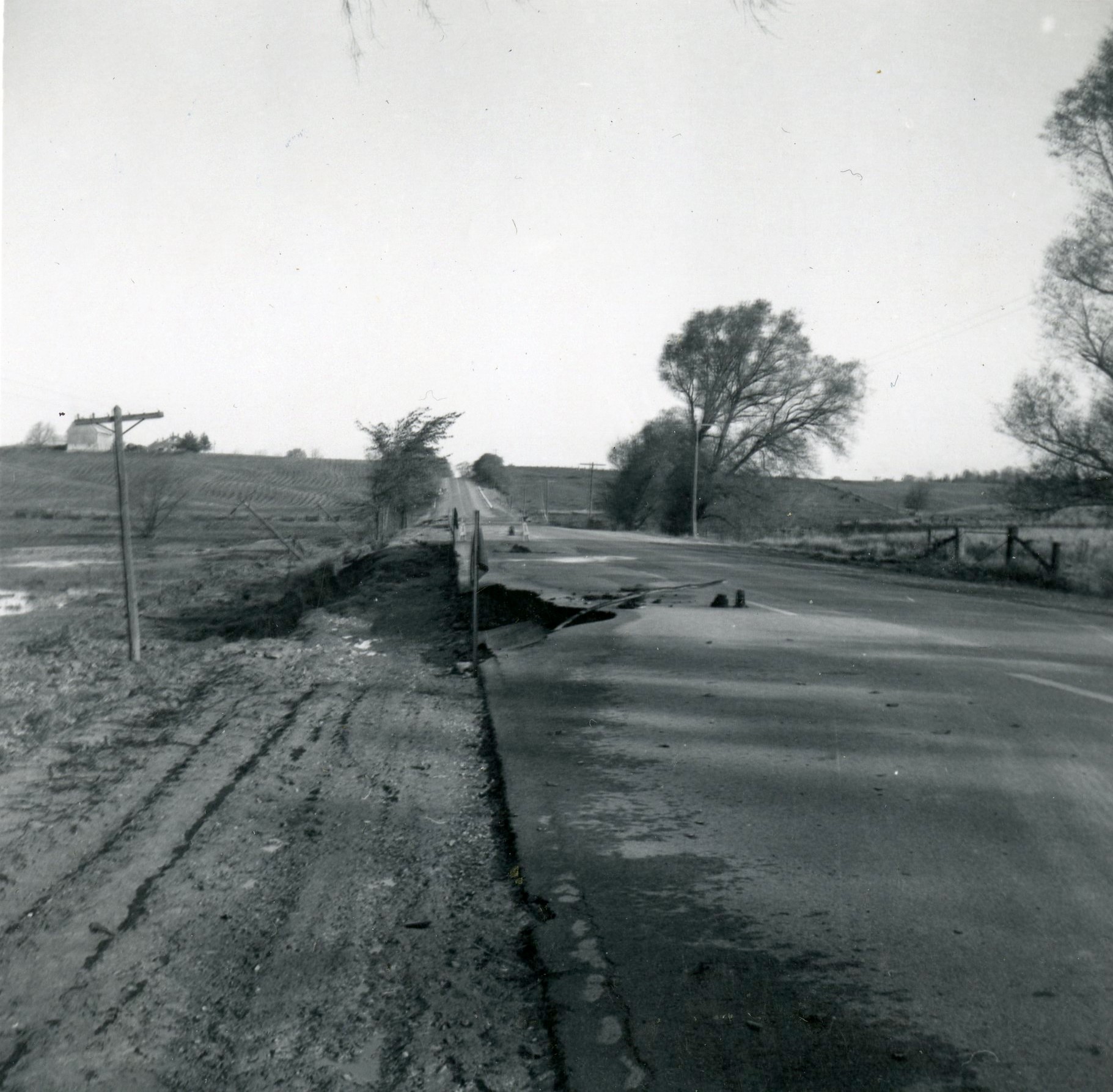 Photo of a section of road west of Cookstown that collapsed after Hurricane Hazel hit in October 1954. A crowd of onlookers stands at the edge of the collapse, surveying the damage.