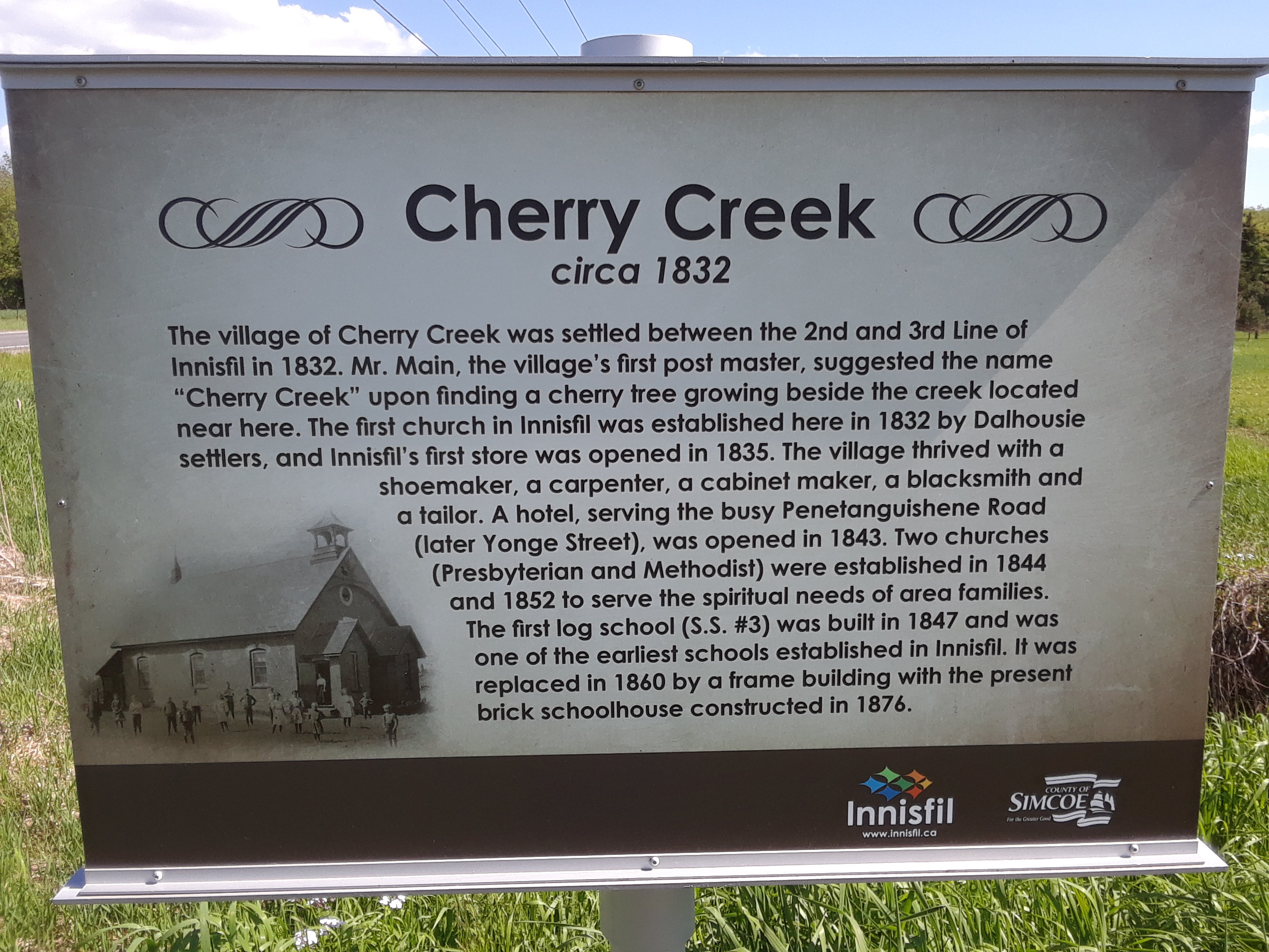 Historic plaque located on Yonge Street, near Line 3. The plaque bears the logos of the Town of Innisfil and the County of Simcoe, as well as an image of a school house with a number of people posing for a photo outside. The sign reads: "The village of Cherry Creek was settled between the 2nd and 3rd Line of Innisfil in 1832. Mr. Main, the village's first post master, suggested the name "Cherry Creek" upon finding a cherry tree growing beside the creek located near here. The first church in Innisfil was established here in 1832 by Dalhousie settlers, and Innisfil's first store was opened in 1835. The village thrived with a shoemaker, a carpenter, a cabinet maker, a blacksmith and a tailor. A hotel, serving the busy Penetanguishene Road (later Yonge Street), was opened in 1843. Two churches (Presbyterian and Methodist) were established in 1844 and 1852 to serve the spiritual needs of the area families. The first log school (S.S. #3) was built in 1847 and was one of the earliest schools established in Innisfil. It was replaced in 1860 by a frame building with the present brick schoolhouse constructed in 1876." This photo was taken by Alan Budd.