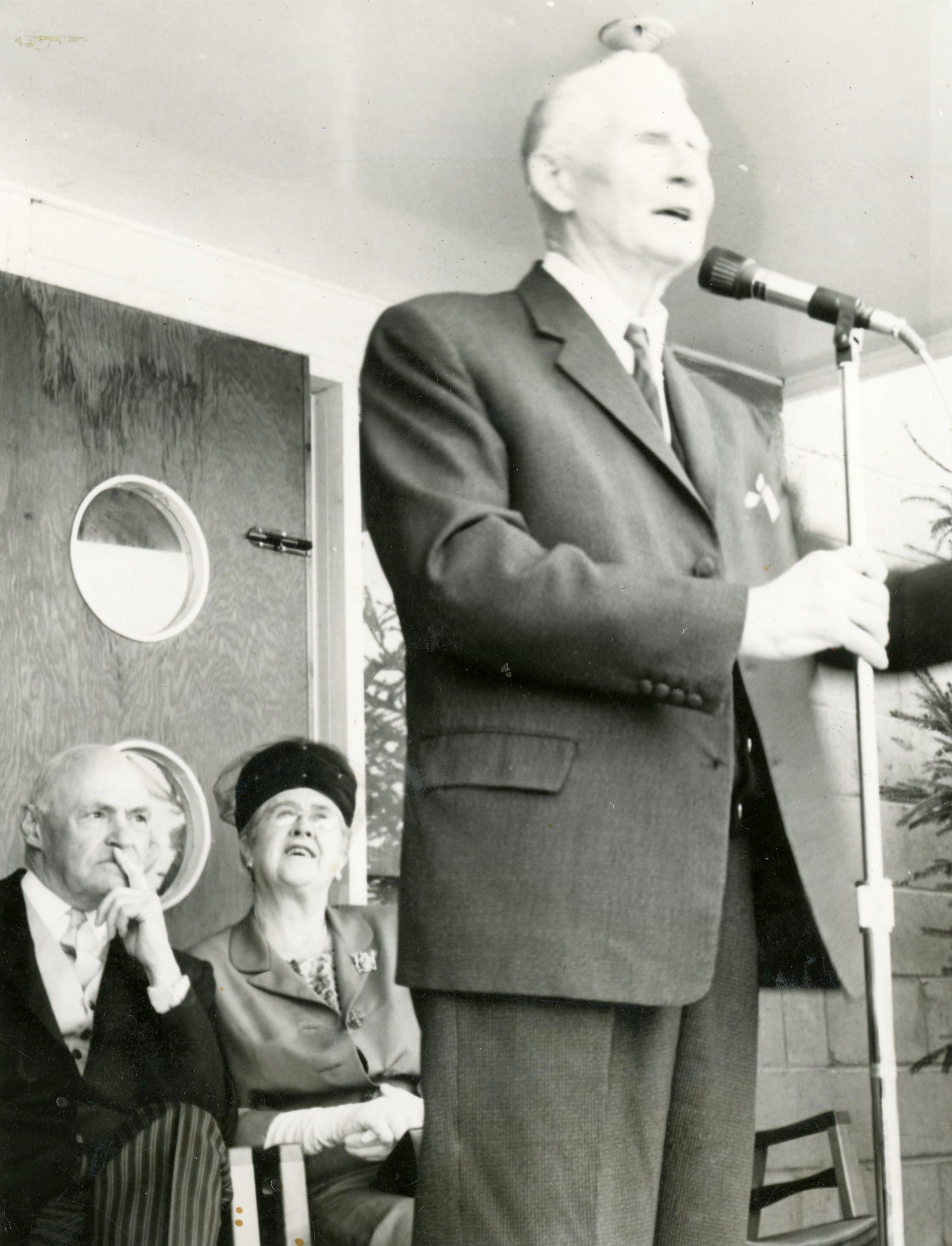 Tom King delivers a speech at the Cookstown Fairgrounds with Mr. Earl Rowe and Mrs. Rowe in the background.