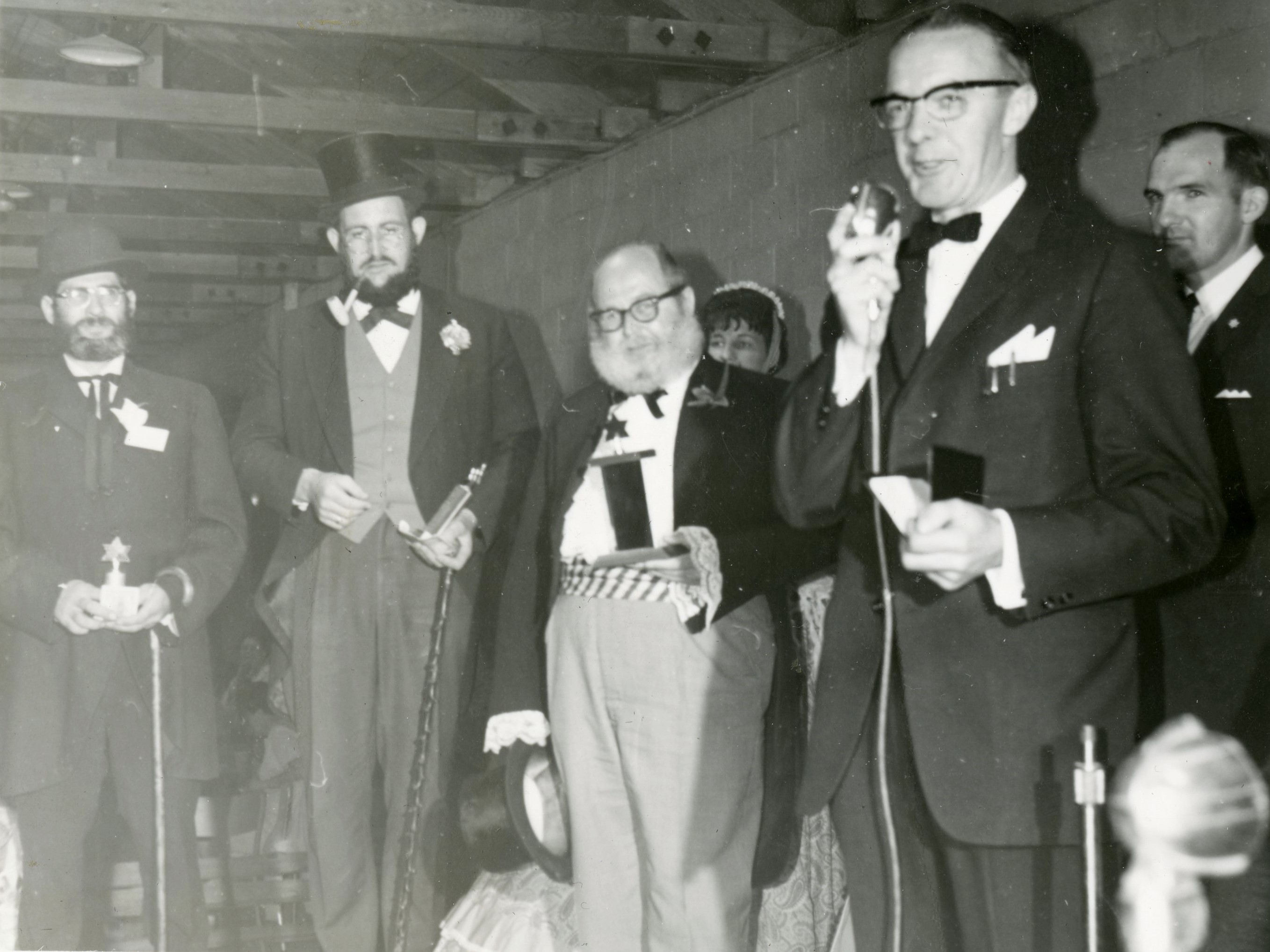 Group of people in period costume with some holding awards, one man speaking. Pictured are Mr. Wood, Calvin Madill, Charlie Jevons, Ken Crawford, and Jim Curre.