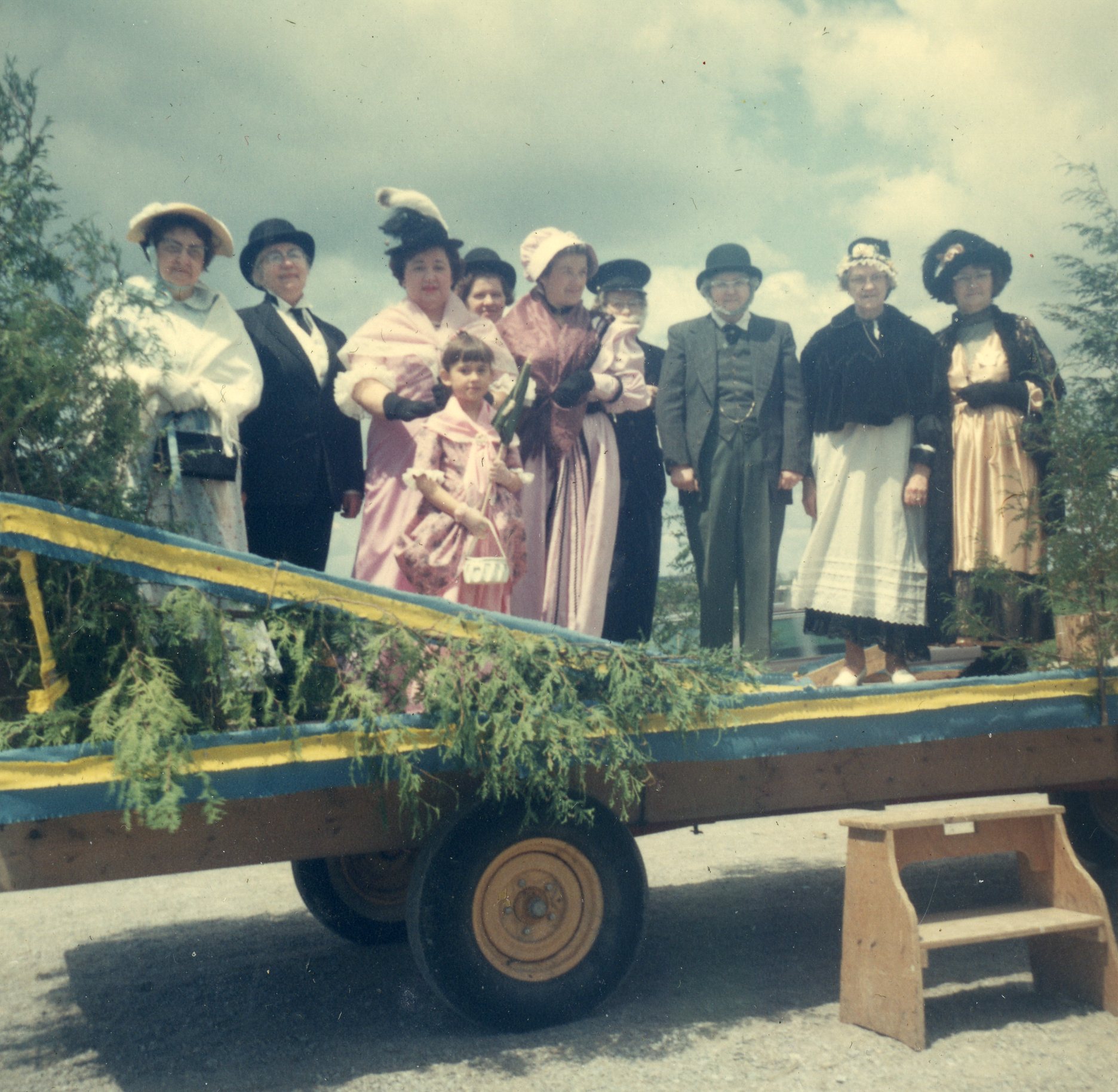 Group of people riding on a float in vintage dress. Pictured are: Muriel Smith, Lil Cook, Ann Monkman, Lena Lund, Olive Parker, Marj Hansen, Keatha Riley, Laura Meyes, Alice Baker, and Cathy Monkman.