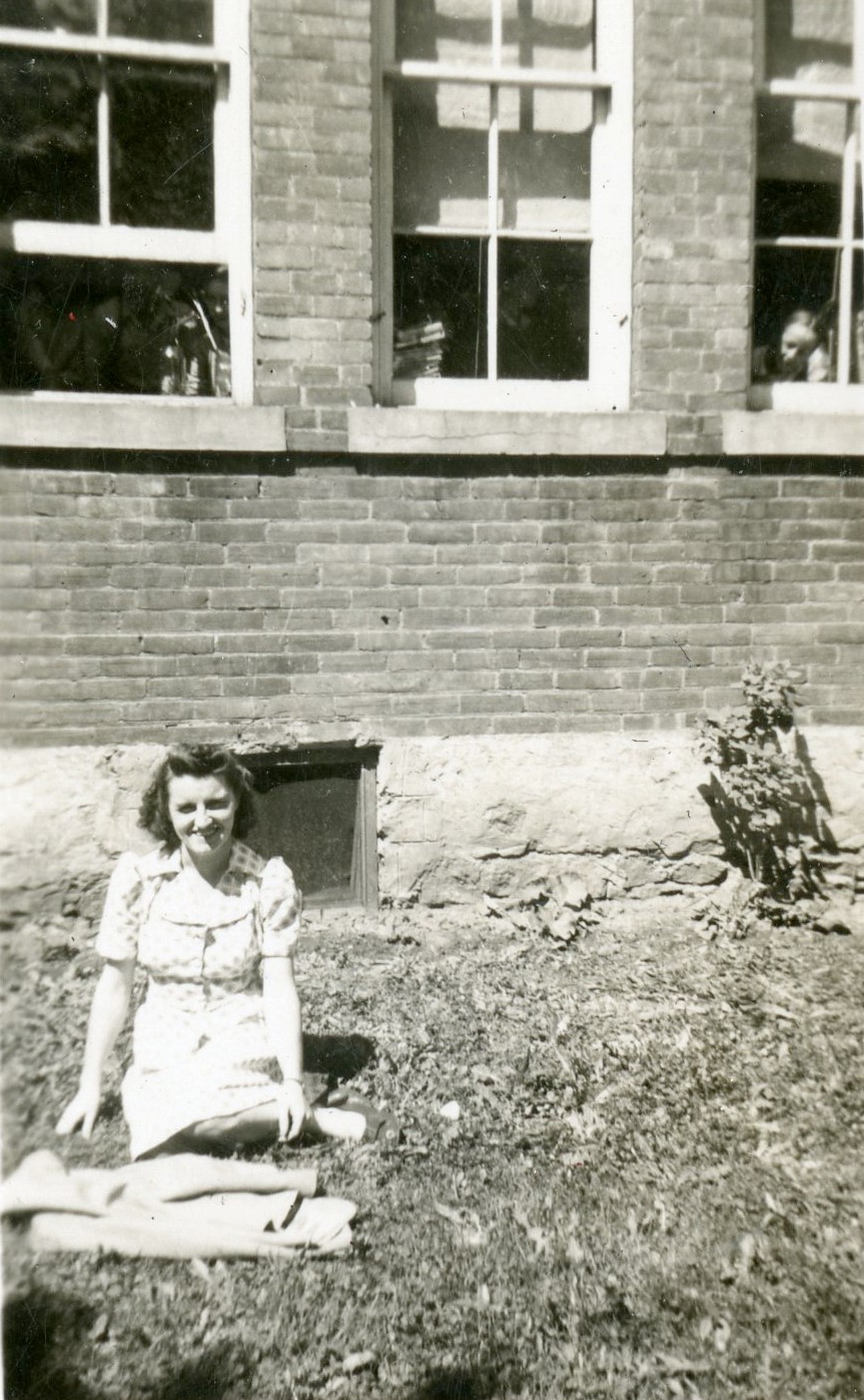 Photo of Doris Mapes sitting in the grass in front of a brick building, likely a school.