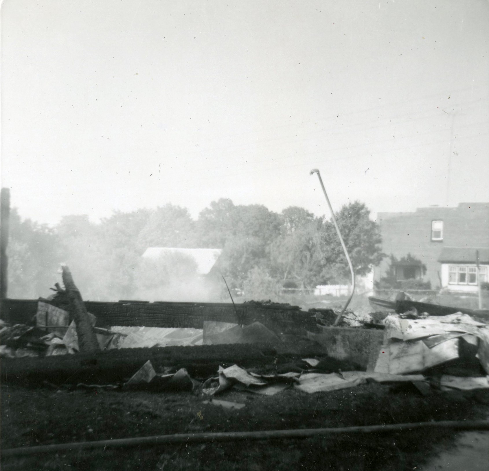 Picture showing smoke and charred rubble from a fire that destroyed the Dunning family's garage (next to the Jebb family's garage). The fire was strong enough to warp a lamppost on the street.