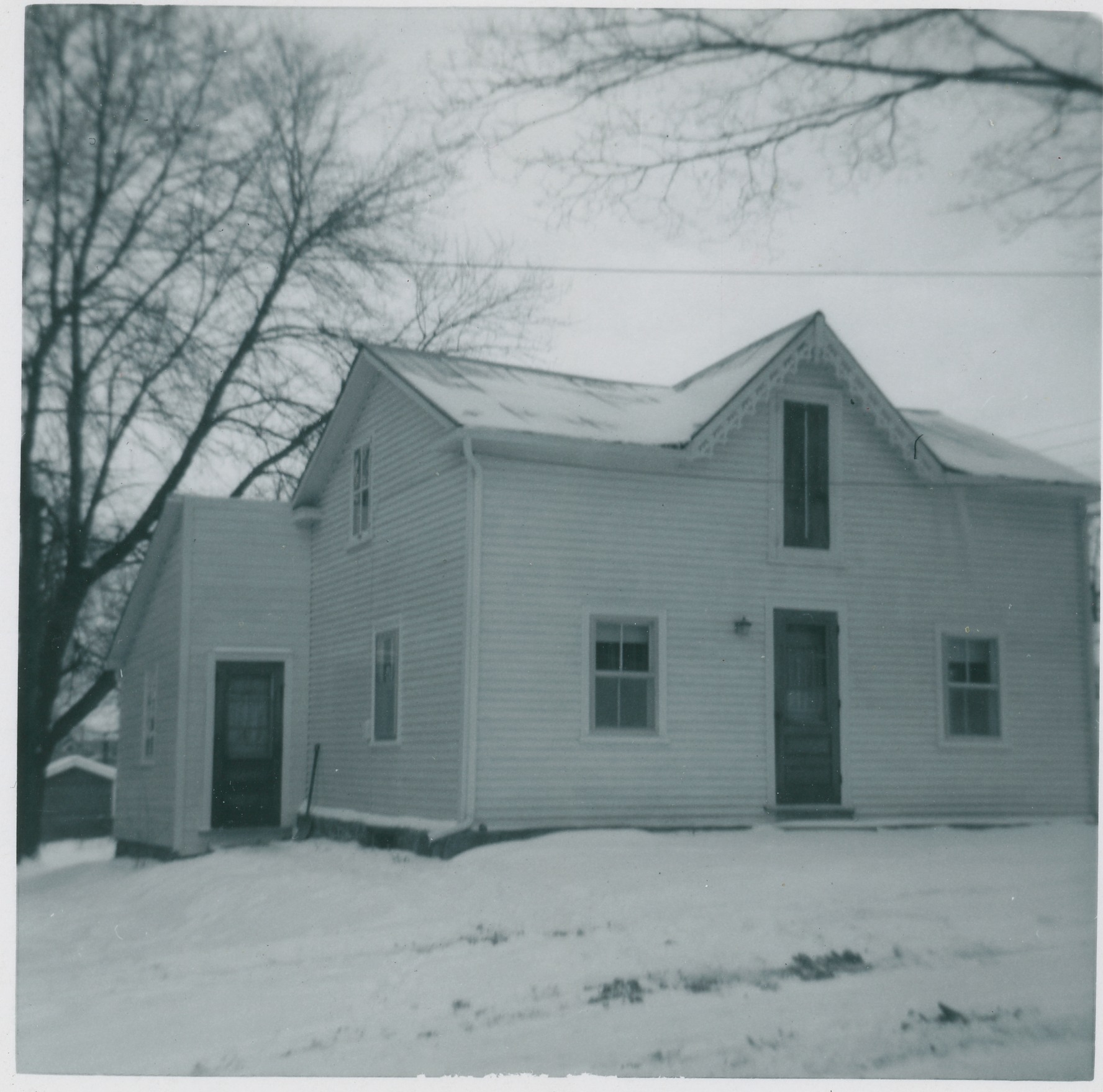Photo of white clapboard, two-storey house with dormer and front entrance and side entrance