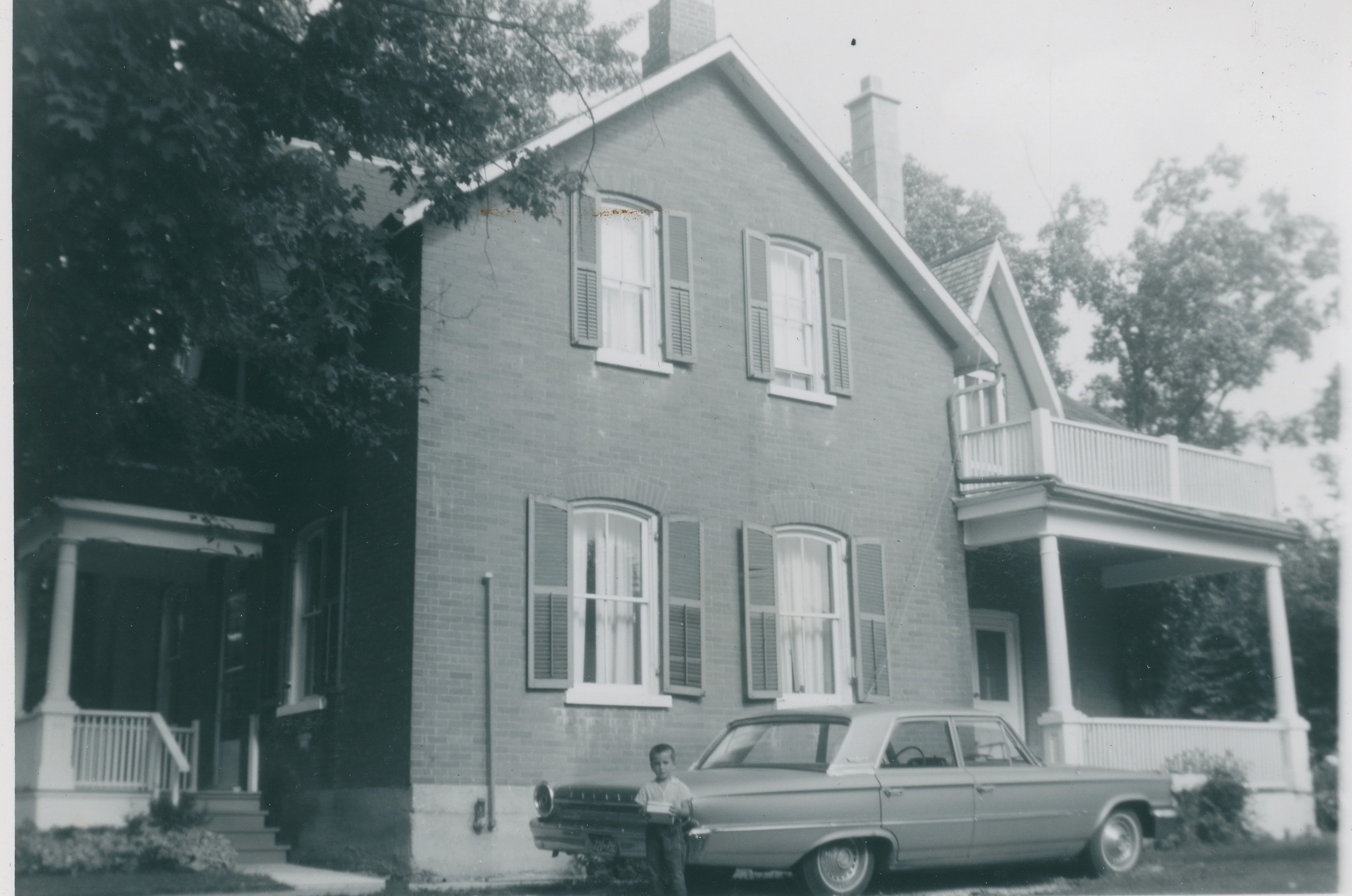 Shows a lovely brick house with front and side porches, verandas plus vintage car, and young boy