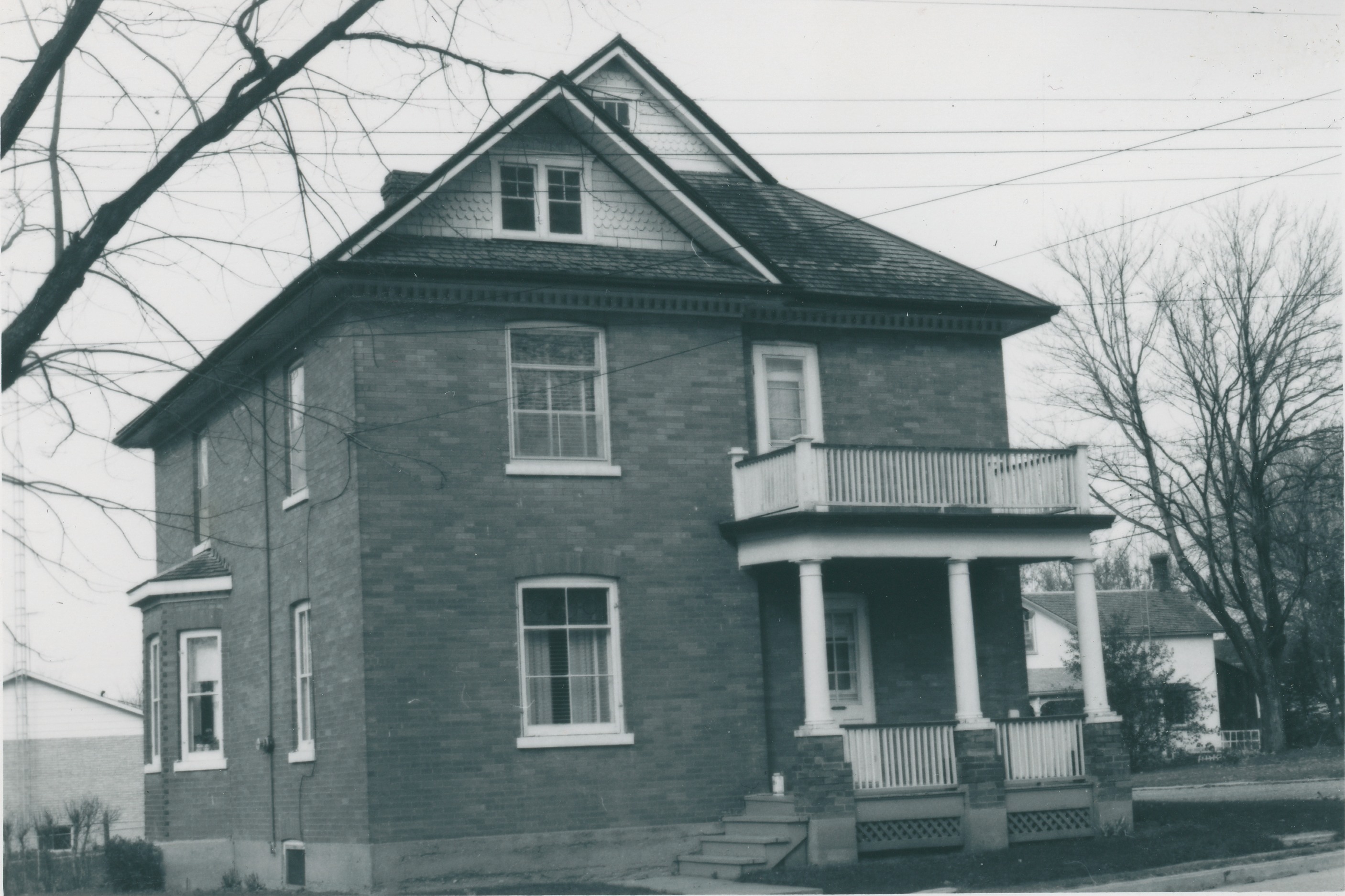 Two-storey brick house with recessed front entrance, two-storey porch and attic