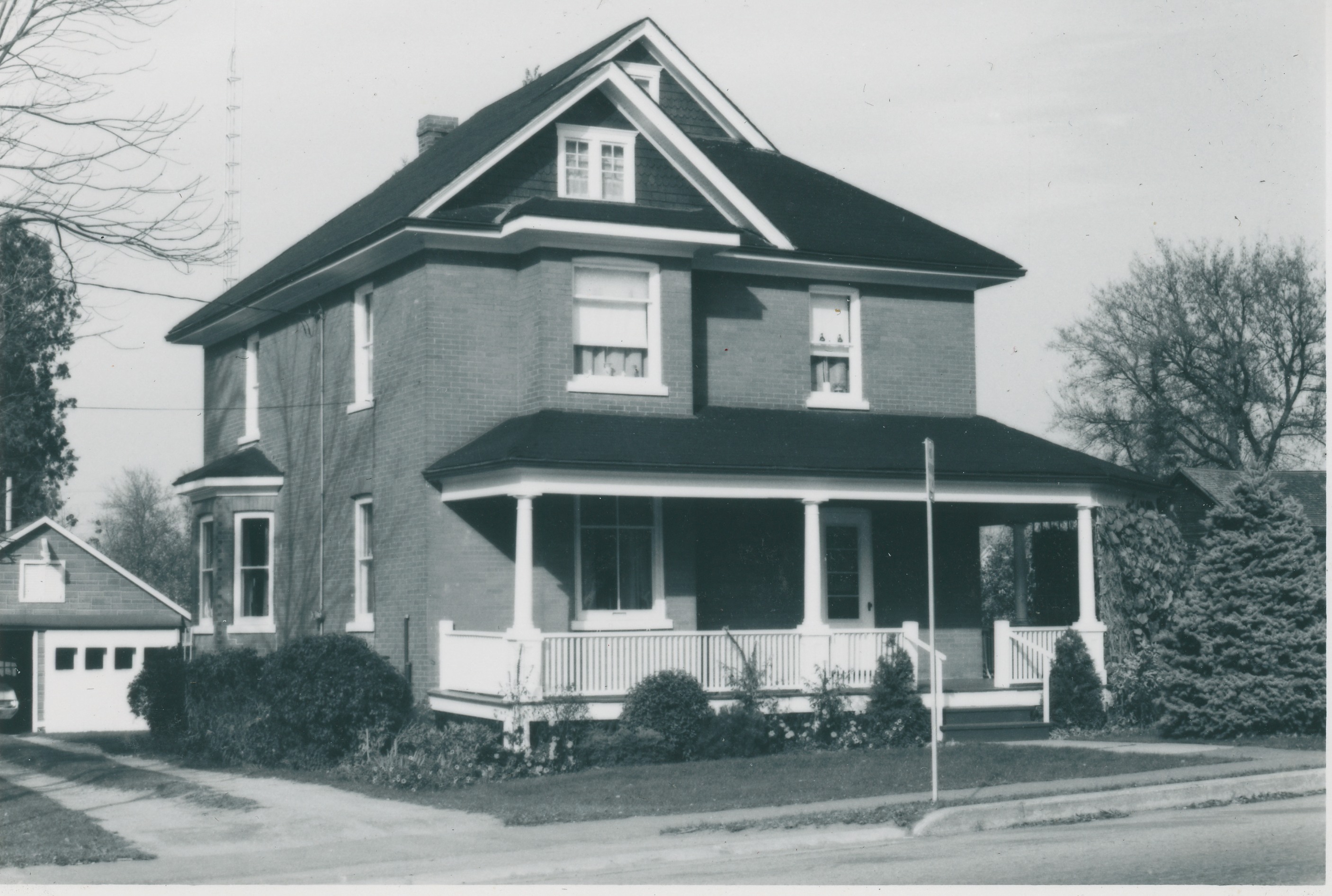Two-storey brick house with covered front porch with railing, dormers and detached garage