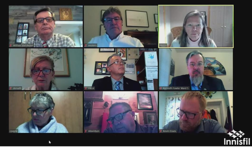 A screen capture of Innisfil's first ever virtual Council meeting. The meeting took place online after social distancing measures were introduced to limit public gathering to slow the spread of Covid-19. This meeting used Zoom software and was live-streamed to YouTube. The meeting featured Mayor Lynn Dollin, Deputy Mayor Daniel Davidson, Ward 1 Councillor Kevin Eisses, Ward 2 Councillor Bill Van Berkel, Ward 3 Councillor Donna Orsatti, Ward 4 Councillor Alex Waters, Ward 5 Councillor Kenneth Fowler, Ward 6 Councillor Carolyn Payne, and Ward 7 Councillor Rob Nicol. The meeting took place at 6:30 p.m. on Wednesday 25 March 2020. As it was a Special Council Meeting, there was no open forum and no delegations. A recording of the meeting can also be found at https://www.youtube.com/watch?v=BKHRRRBeG9M