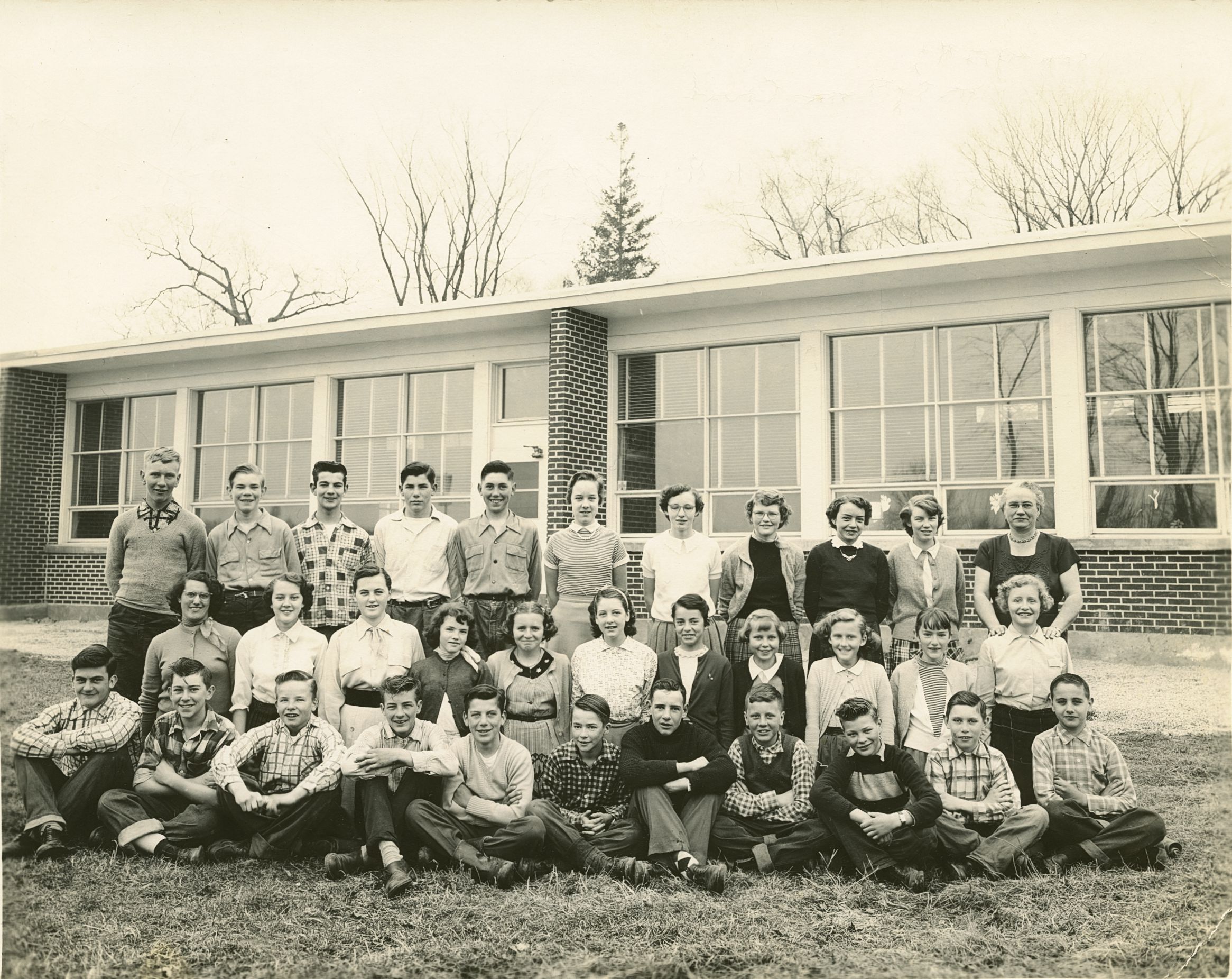 Photo of the senior room class of 1955-56 at the Painswick School with teacher Mrs. Martin. Pictured from left to right, back row: Jack Nesbitt (grade 8), Gerald Chard (grade 7), Barry Finnis (grade 8), Ross Webb (grade 8), Ivan Atkinson (grade 8), Colleen Campbell (grade 7), Joyce Pratt (grade 8), Iris Webb (grade 8), Marilyn Reynolds (grade 8), Donna Chard (grade 8), and teacher Mrs. Martin. Middle row: Phoebe Randall (grade 8), Charlotte McKeown (grade 8), Helen Atkinson (grade 8), Cecilia Reynolds (grade 7), Shirley Kelly (grade 7), Katherine Borneman (grade 7), Marion Fairchild (grade 7), Barbara Penman (grade 7), Carol Shaw (grade 7), Gail Smith (grade 8), and Valerie Westman (grade 7). Front row: Murray Irwin (grade 7), Larry Boyd (grade 8), Michael Reynolds (grade 8), Larry Skinner (grade 8), Bill Burton (grade 8), George Martin (grade 8), Kenneth Borneman (grade 7), Anthony Knowles (grade 7), Harvey Skinner (grade 7), Peter Sisler (grade 7), and Ronnie Batters (grade 7). Missing from the photo is Alex Charpentier (grade 7). Photo and names were provided to Bill Warnica by Valerie Francis (formerly Valerie Westman).