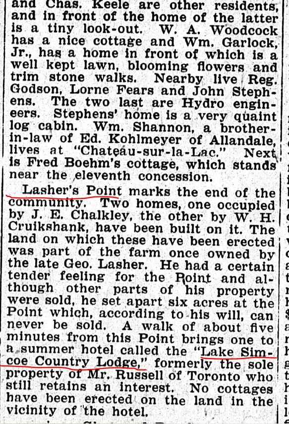 Copy of a newspaper clipping (publication and date unknown) discussing Lasher's Point and the summer hotel known as Lake Simcoe Country Lodge, formerly located somewhere between the 9th and 11th concessions on Lake Simcoe.