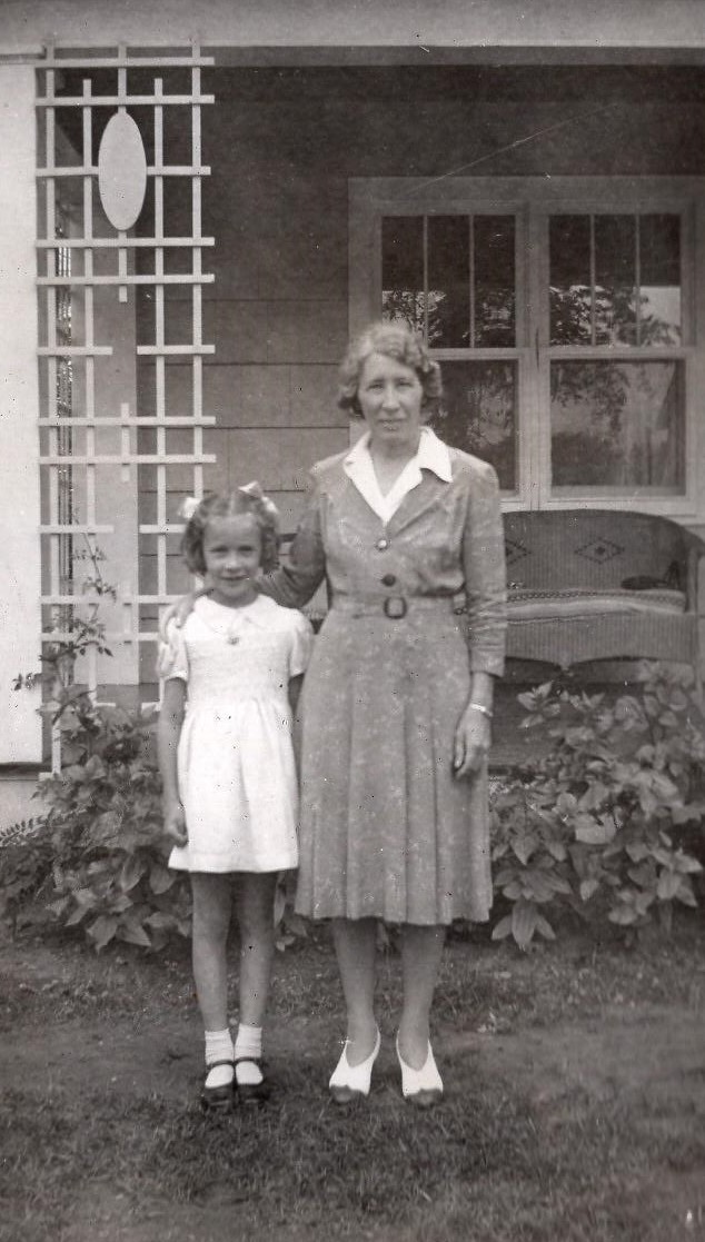 Black and white photo of Sheila Reive [left] with Jessie Reive Grose [right] standing in front of a Church St. house in Lefroy from approximately 1940. This photo was donated to the Innisfil Historical Society by Janice Mason.