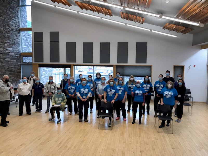Photo of the team distributing vaccines at a pop-up vaccination clinic for Covid-19 at Sandycove on Tuesday March 16, 2021. Image courtesy of the Simcoe Muskoka District Health Unit.