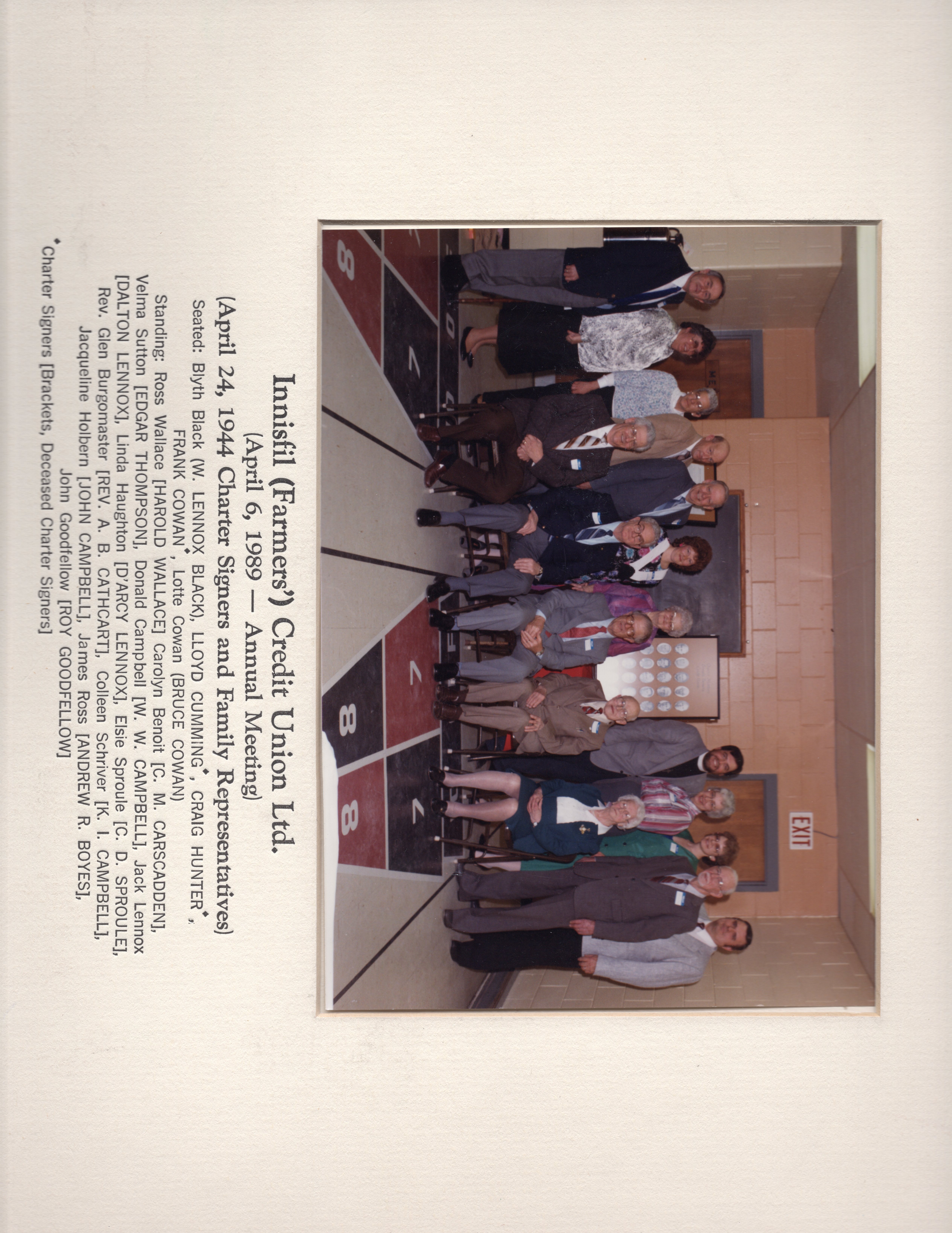 Colour photo of the Innisfil (Farmer's) Credit Union Ltd. Annual meeting, which took place on 6 April 1989. Those pictured are listed as the "April 24 1944 Charter Signers and Family Representatives". Those listed with brackets are noted as deceased charter signers whom the family member pictured represents, and those marked with asterisks are charter signers. Pictured from left to right, front row, seated: Blyth Black (W. Lennox Black), Lloyd Cumming*, Craig Hunter*, Frank Cowan*, and Lotte Cowan (Bruce Cowan). Back row, standing: Ross Wallace (Harold Wallace), Carolyn Benoit (C.M. Carscadden), Velma Sutton (Edgar Thompson), Donald Campbell (W.W. Campbell), Jack Lennox, Rev. Glen Burgomaster (Rev. A.B. Cathcart), Elsie Sproule (C.D. Sproule), Jacqueline Holbern (John Campbell), James Ross (Andrew R. Boyes), and John Goodfellow (Roy Goodfellow). The photo appears to have been taken inside the Stroud Library.