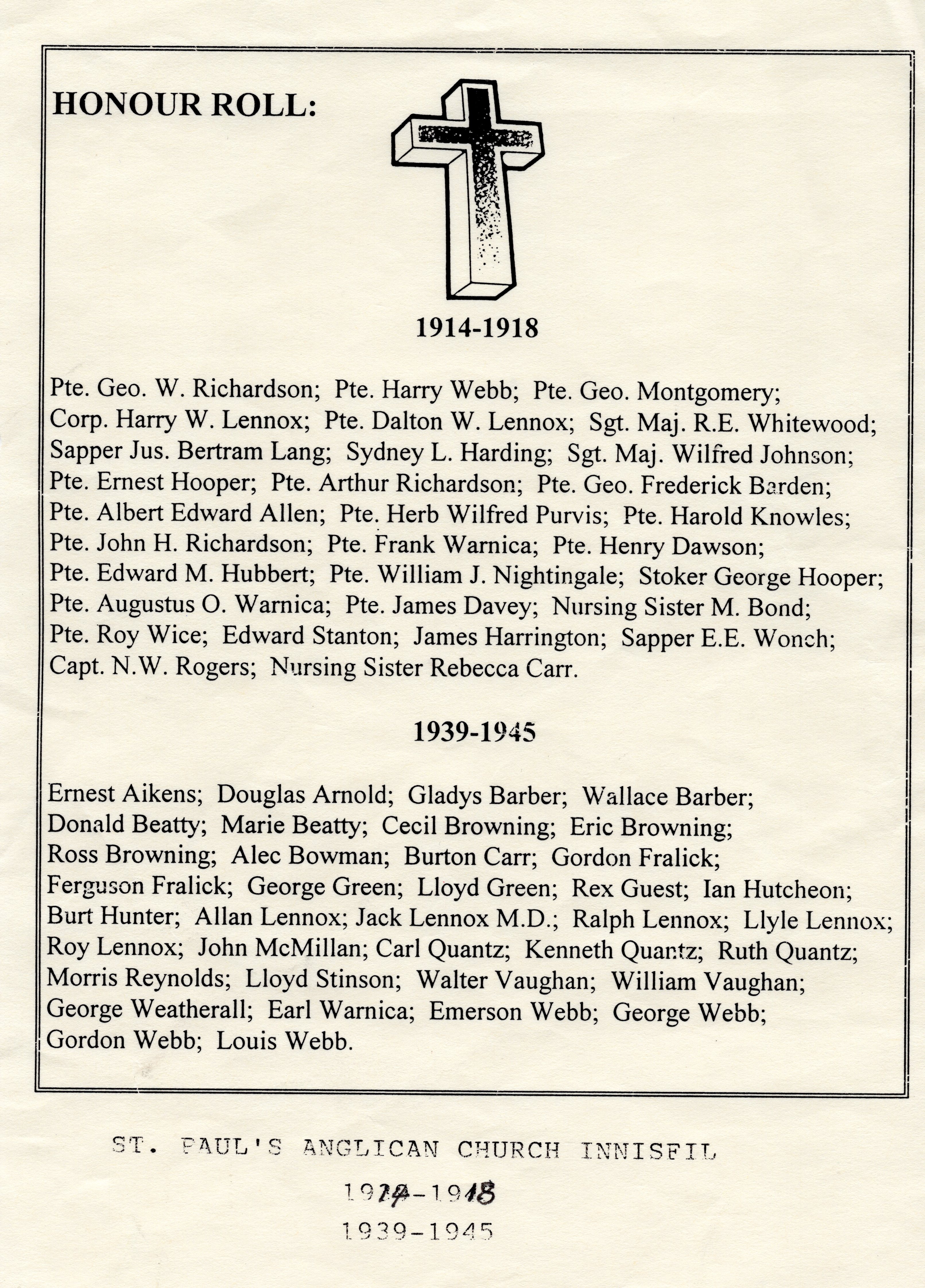 Typed "honour roll" or list of names of parishioners of St. Paul's Anglican Church in Innisfil who had served in World War I (1914-1918) and World War II (1939-1945). The list for WWI reads: Pte. Geo. W. Richardson, Pte. Harry Webb, Pte. Geo. Montgomery, Corp. Harry W. Lennox, Pte. Dalton W. Lennox, Sgt. Maj. R.E. Whitewood, Sapper Jus. Bertram Lang, Sydney L. Harding, Sgt. Maj. Wilfred Johnson, Pte. Ernest Hooper, Pte. Arthur Richardson, Pte. Geo. Frederick Barden, Pte. Albert Edward Allen, Pte. Herb Wilfred Purvis, Pte. Harold Knowles, Pte. John H. Richardson, Pte. Frank Warnica, Pte. Henry Dawson, Pte. Edward M. Hubbert, Pte. William J. Nightingale, Stoker George Hooper, Pte. Augustus O. Warnica, Pte. James Davey, Nursing Sister M. Bond, Pte. Roy Wice, Edward Stanton, James Harrington, Sapper E.E. Wonch, Capt. N.W. Rogers, and Nursing Sister Rebecca Carr. The list for WWII reads: Ernest Aikens, Douglas Arnold, Gladys Barber, Wallace Barber, Donald Beatty, Marie Beatty, Cecil Browning, Eric Browning, Ross Browning, Alex Bowman, Burton Carr, Gordon Fralick, Ferguson Fralick, George Green, Lloyd Green, Rex Guest, Ian Hutcheon, Burt Hunter, Allan Lennox, Jack Lennox M.D., Ralph Lennox, Llyle [sic] Lennox, Roy Lennox, John MacMillan, Carl Quantz, Kenneth Quantz, Ruth Quantz, Morris Reynolds, Lloyd Stinson, Walter Vaughan, William Vaughan, George Weatherall, Earl Warnica, Emerson Webb, George Webb, Gordon Webb, and Louis Webb.