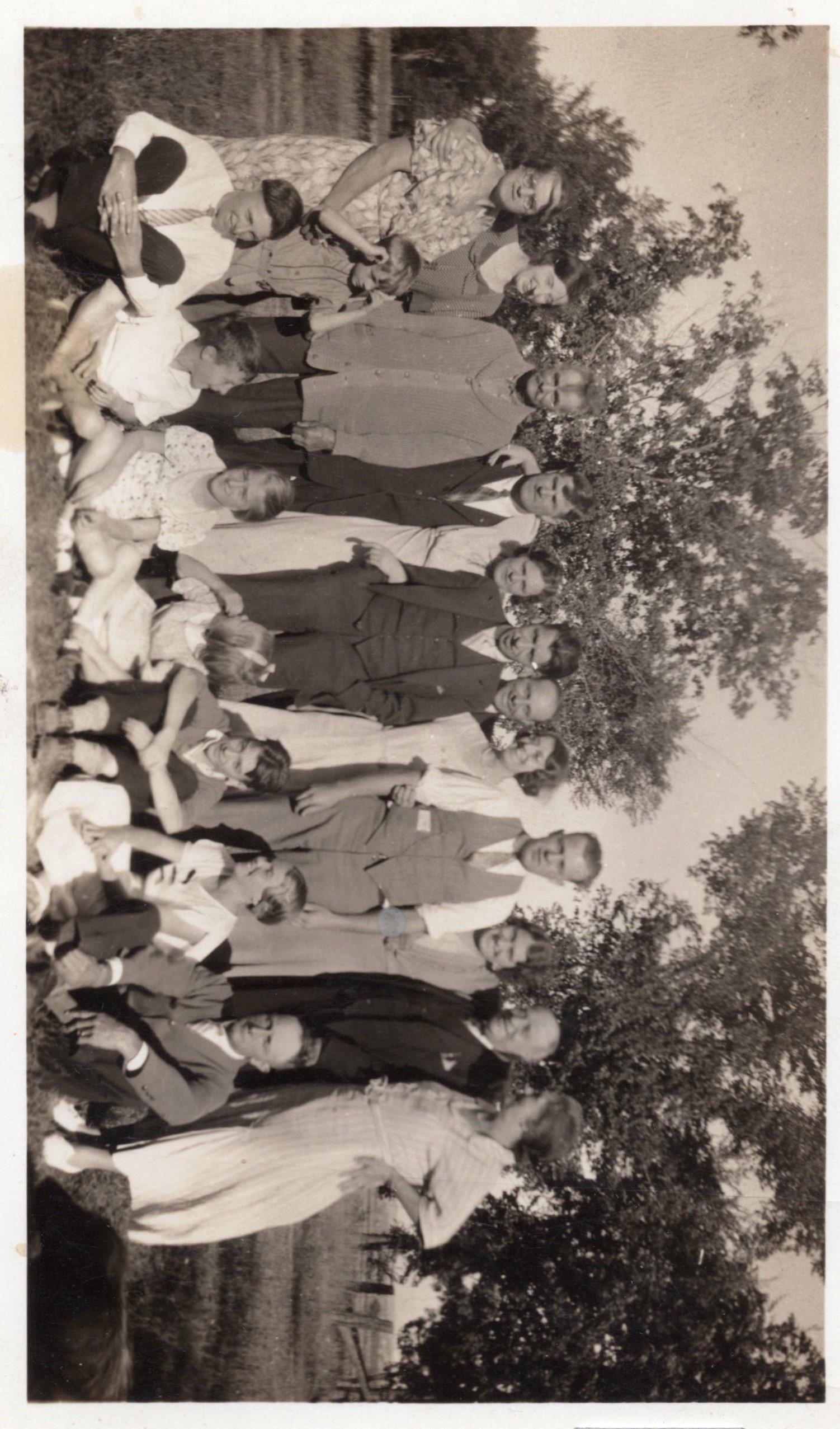 Group photo taken outdoors the Green/Webb/Whitehead/Tollcott family members taken in 1935 at the home of Flos and Clarence McCabe during a visit by the sister of Grandma Green in Connecticut. The people are identified as the following in the front row, left to right: Lloyd Green, Elmer Whitehead, Velma Whitehead, Sylvia Webb, Llyle Whitehead, Doris Webb (later Doris Emrick), and uncle Clarence McCabe. Back row: Aunt Flos McCabe (with young Jack McCabe in front of her), Aunt Dell Green, Grandpa Green, Uncle Frank Green, Aunt Berenice Webb, Roger Webb, Uncle George Whitehead, Aunt Jospehine Green, Aunt Alice Whitehead, Great Uncle Rol Tollcott, Great Aunt Emma Tollcott, (the tall young man), Uncle Ted Green/Philip Tollcott. [The identification has been recorded exactly as it was provided, which does not correspond with the order illustrated in the photo]. The photograph and information was provided by Doris Emrick (née Webb).