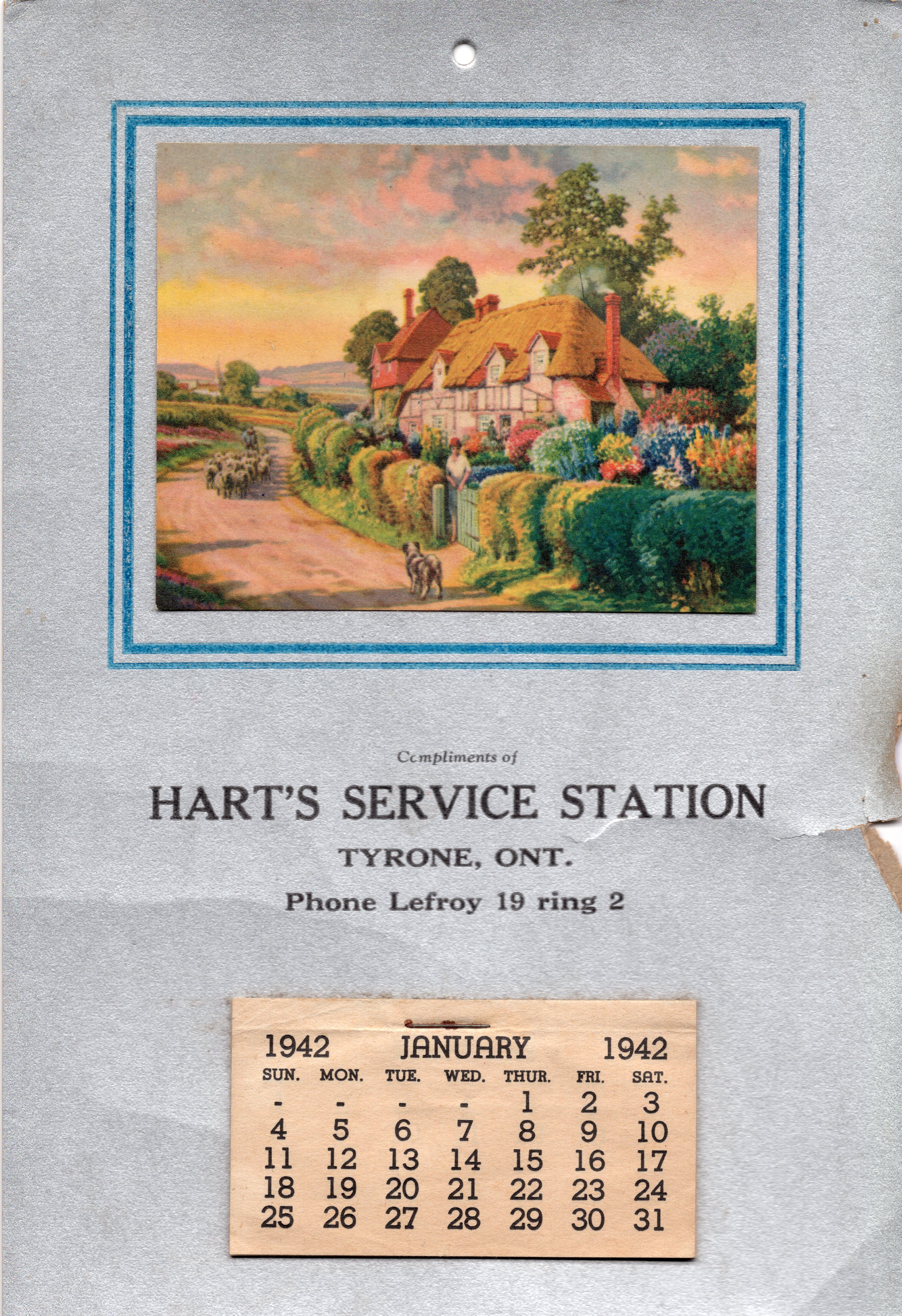 Complimentary calendar for 1942 from Hart's Service Station in Tyrone. The calendar consists of the image of a coloured painting at the top with the message "Complimentary of Hart's Service Station Tyrone, Ont. Phone Lefroy 19 ring 2" and a stack of small rectangular removable papers with each month's calendar stapled to it. Item donated by Dorothy Boyd.