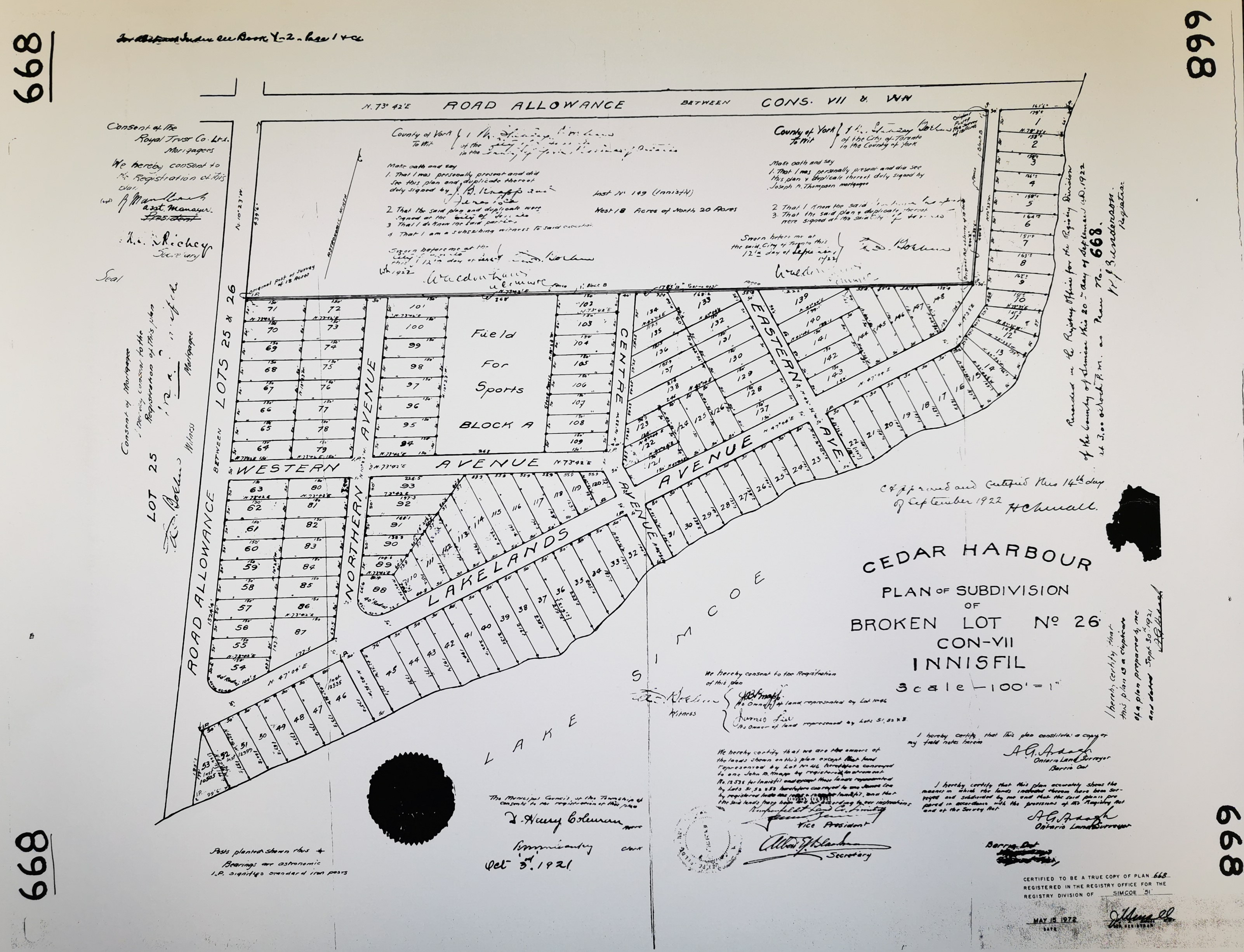 Image of a large format map of lot 26, concession 7 of Innisfil depicting numbered subdivided lots, with handwritten note and marginalia. It is marked as a certified copy of plan 668 registered in the Registry Office for the Registry Division of Simcoe '51', dated to 15 May 1972. It was packaged with a first map where the names of some property owners had been written into their respective lots.