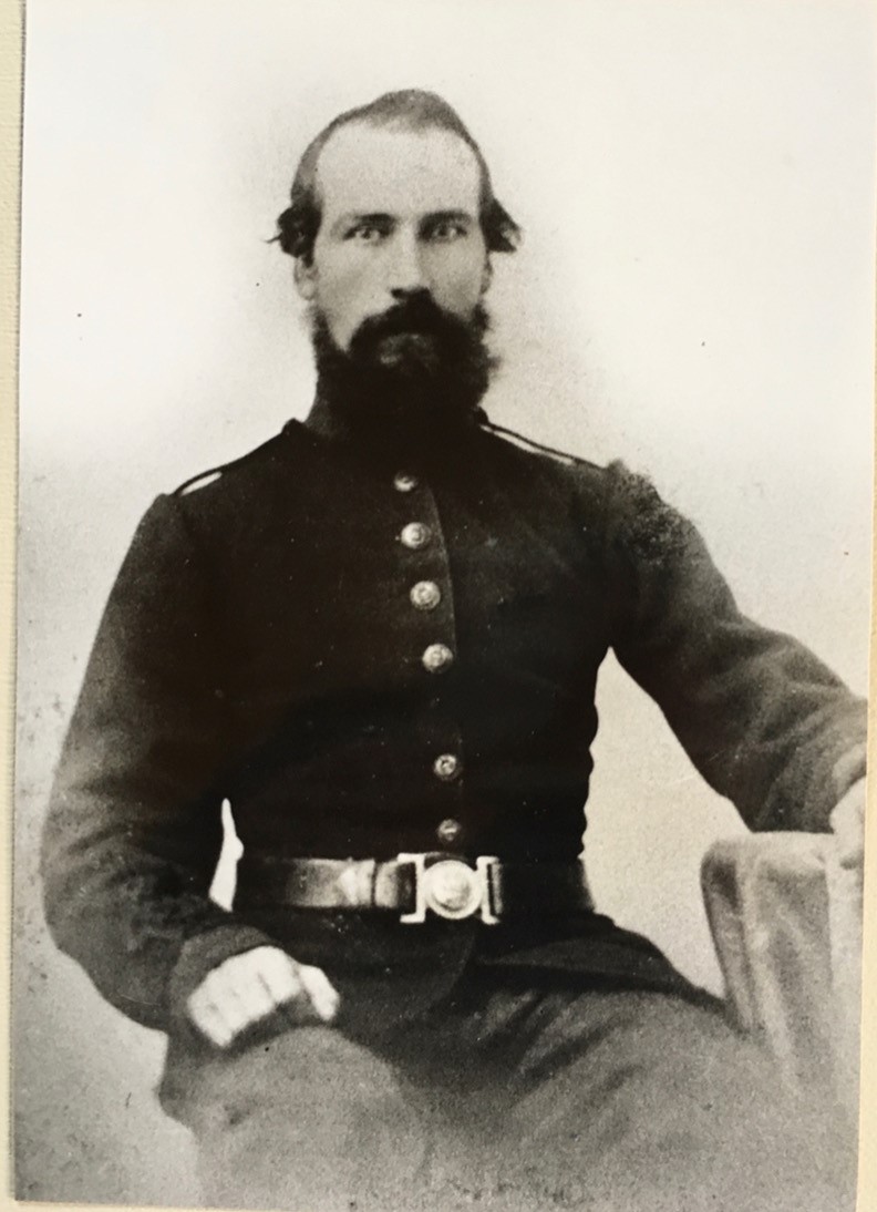 Undated photo of James Baron Cooke seated, wearing an unidentified uniform or military jacket - likely his father's uniform who had fought for the British in the War of 1812 - featuring large buttons and a belt with a metal clasp cinched at the waist. James and his family had moved from Quebec to Barrie, and then to Innisfil in approximately 1877 and settled on a farm at Big Bay Point on lot 30, concession 14. The farm today exists as the Big Bay Point golf course as well as a strip of waterfront that had been converted into cottage waterfront lots. Photo donated to Bill Warnica by Nanci Patten, the second great-granddaughter of James Baron Cooke and his wife Mary Alice Booth. James was also a carpenter, and some of the furniture he built remains with his descendants.
