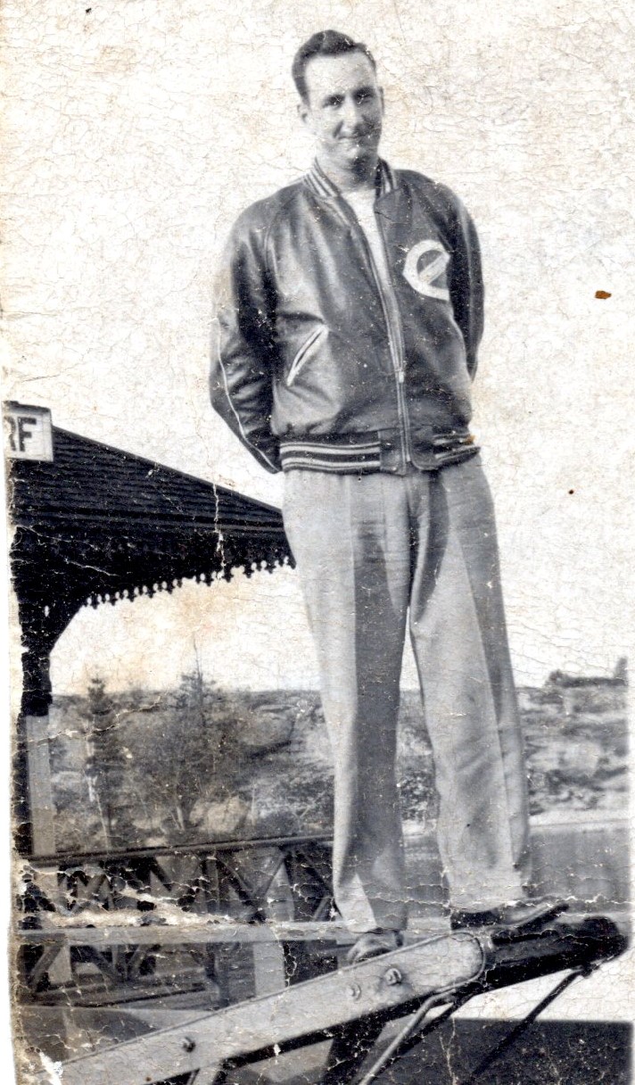 Black-and-white photograph of Blake Constable, taken during his time in Gravenhurst. He wears a leather jacket and stands on what appears to be a conveyor belt. Taken circa the mid-to-late 1940s