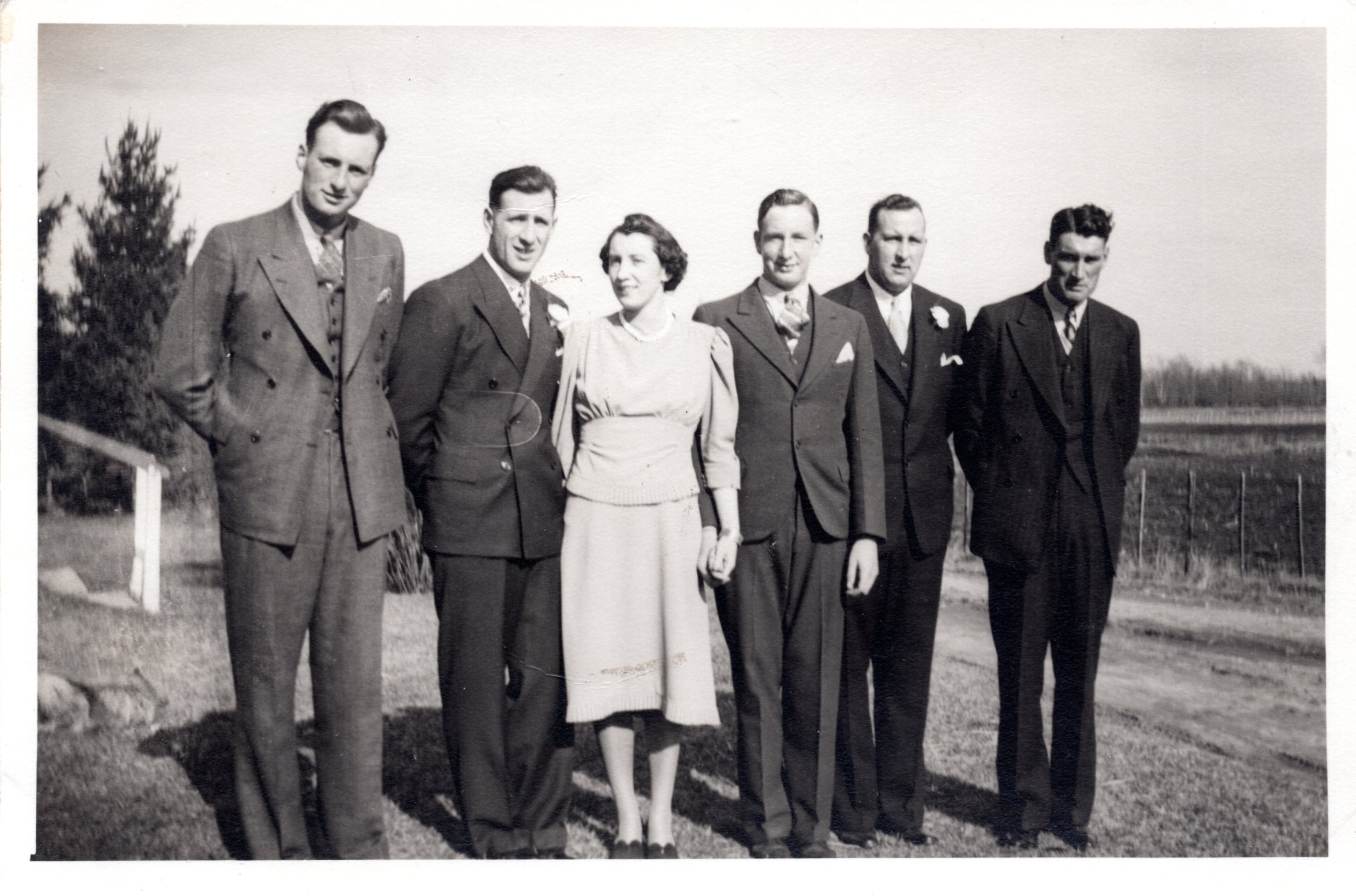 Black and white photo of the Constable family taken on the occasion of Jack Constable's wedding to Dorothy Allan on 20 April 1940. Pictured standing, from left to right: Ralph, Jack, Mina Kelly (née Constable), Blake, Bill, and Mac Constable.
