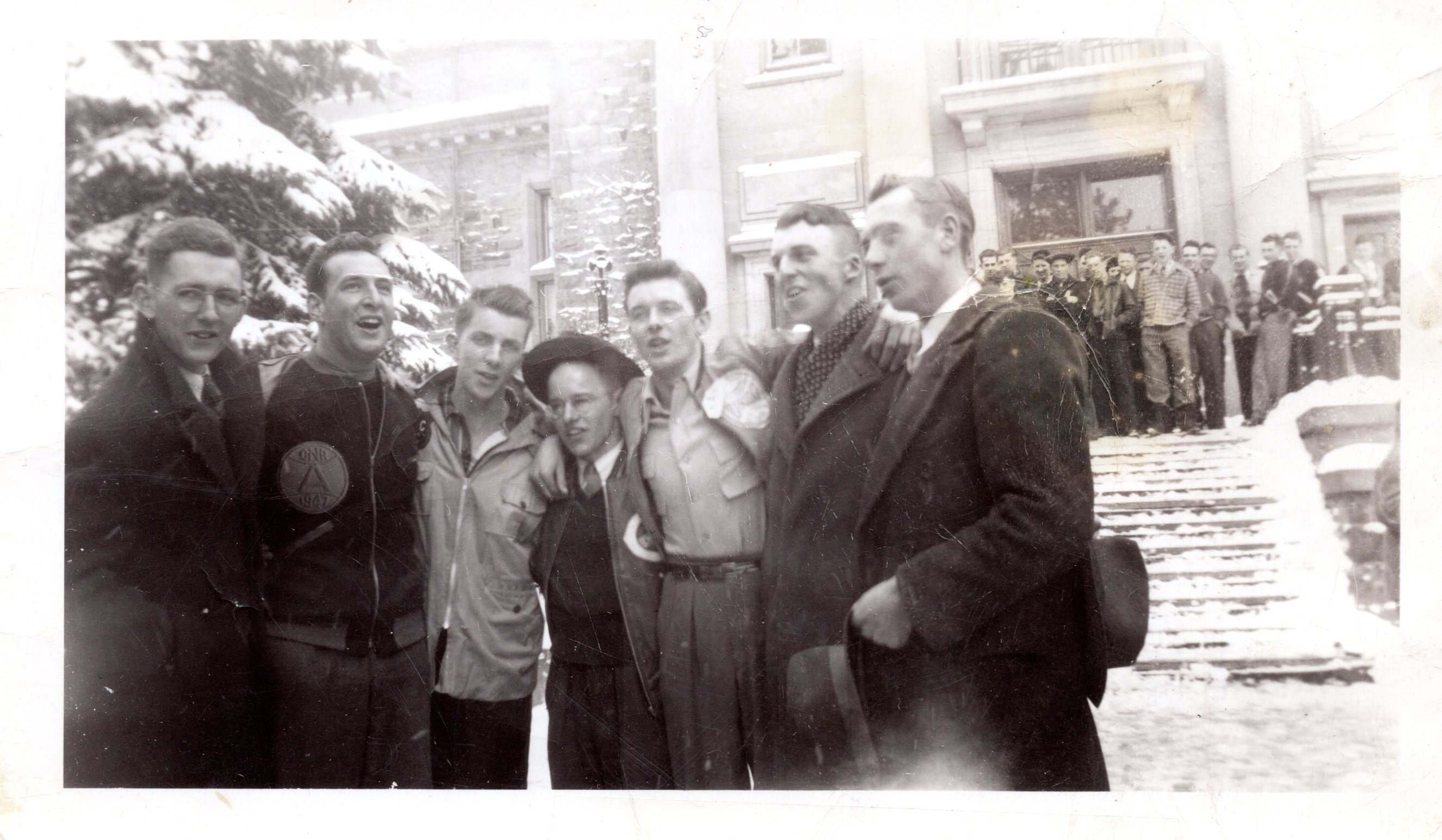 Black and white photo of the men's short chorus of the Junior Farmers group at the University Guelph. Pictured second from left is Blake Constable, with Sam Neilly (also from Innisfil) third from left beside him. The men are dressed in coats and have their arms around each other's shoulders while a crowd of students looks on from the steps of building behind them. There is snow on the ground and in the trees.