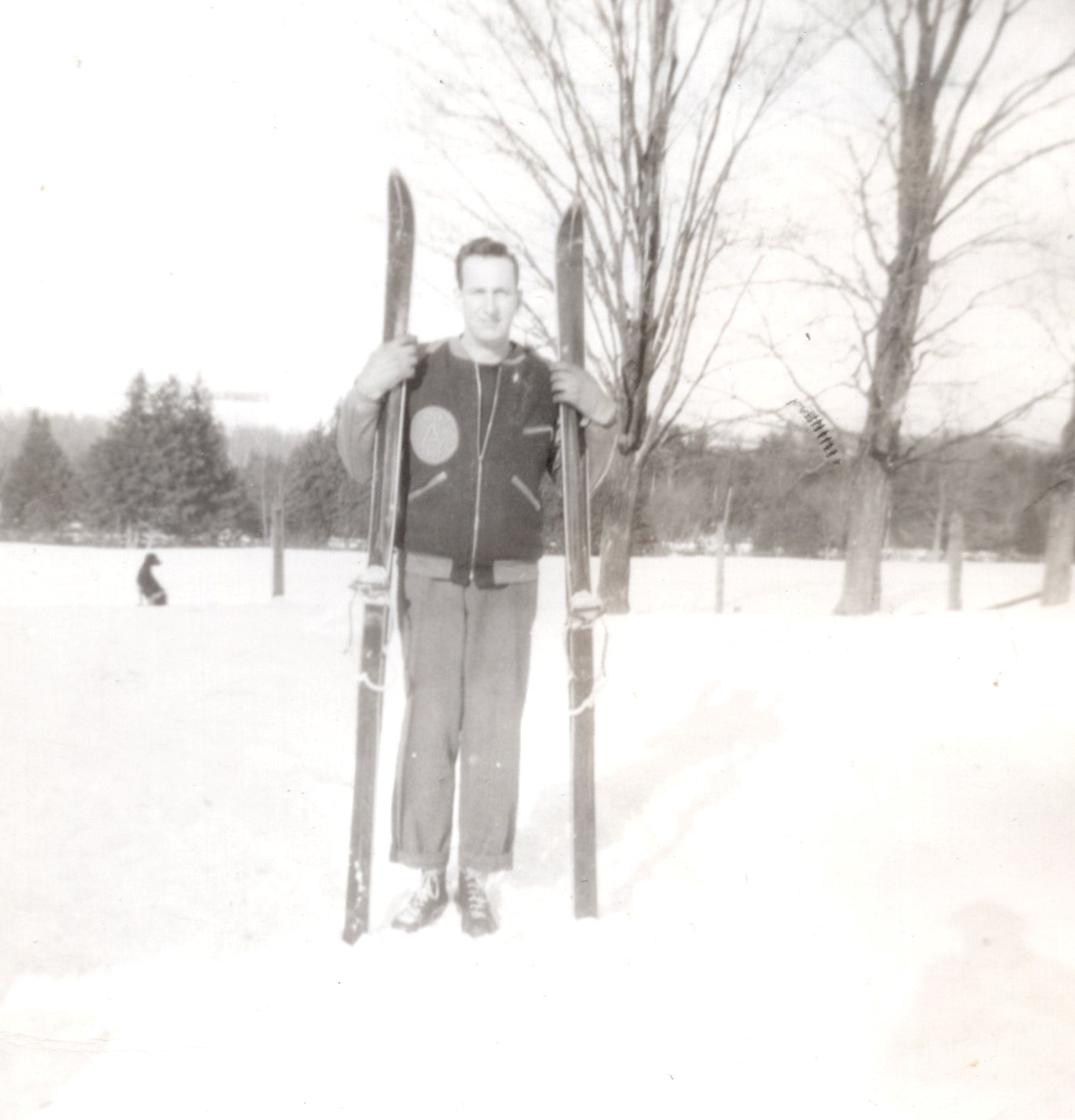 Partially faded black-and-white image of Blake Constable, in his early twenties, posing with a pair of skis. Trees are visible in the background. Taken in February 1948.