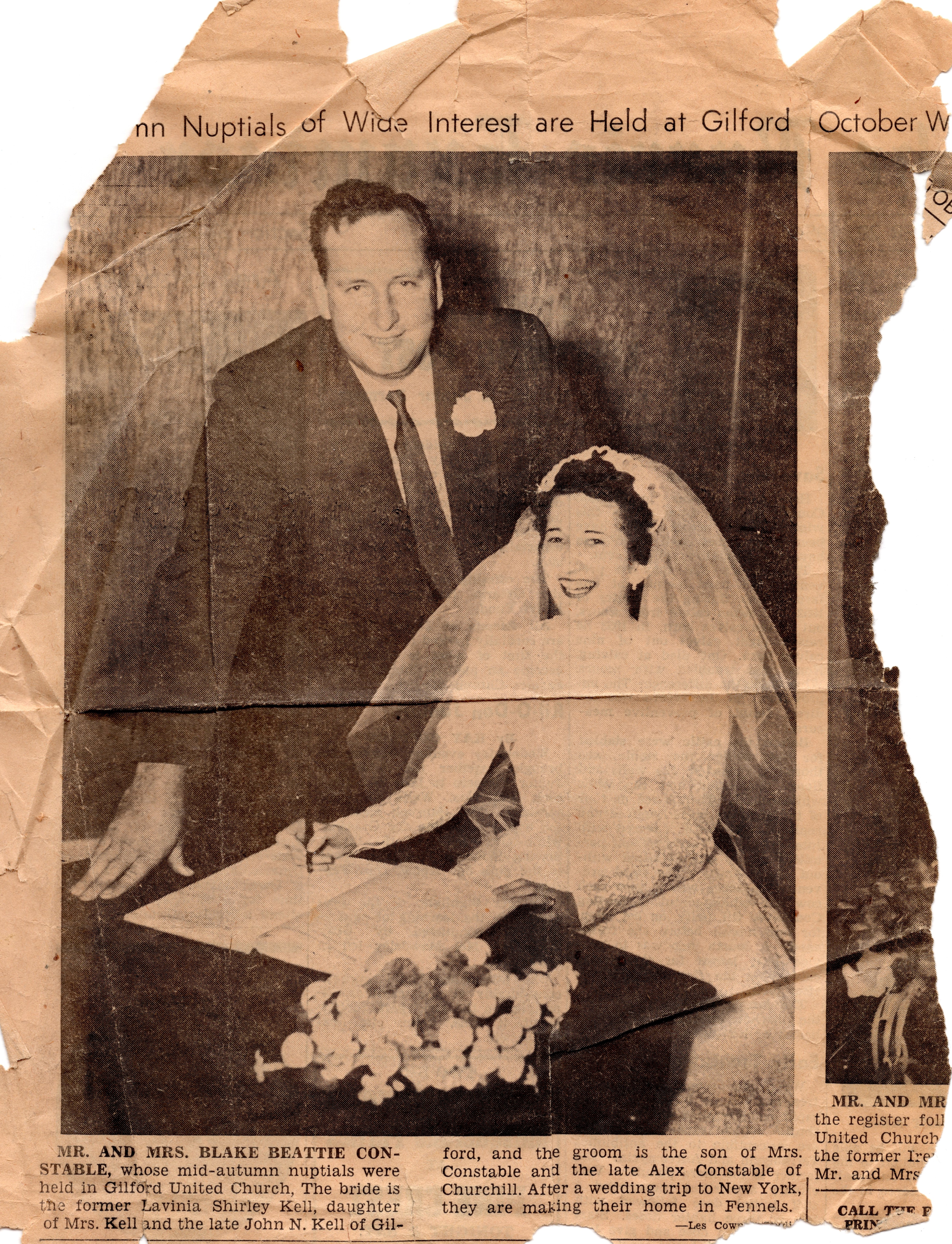 Newspaper clipping featuring a photo of newlyweds Blake Beattie Constable and Lavinia Shirley Kell. The bride is seated and posed signing a document while the groom stands behind her. The caption reads: "Mr. and Mrs. Blake Beattie Constable whose mid-autumn nuptials were held in Gilford United Church. The bride is the former Lavinia Shirley Kell, daughter of Mrs. Kell and the late John N. Kell of Gilford, and the groom is the son of Mrs. Constable and the late Alex Constable of Churchill. After a wedding trip to New York, they are making their home in Fennels."