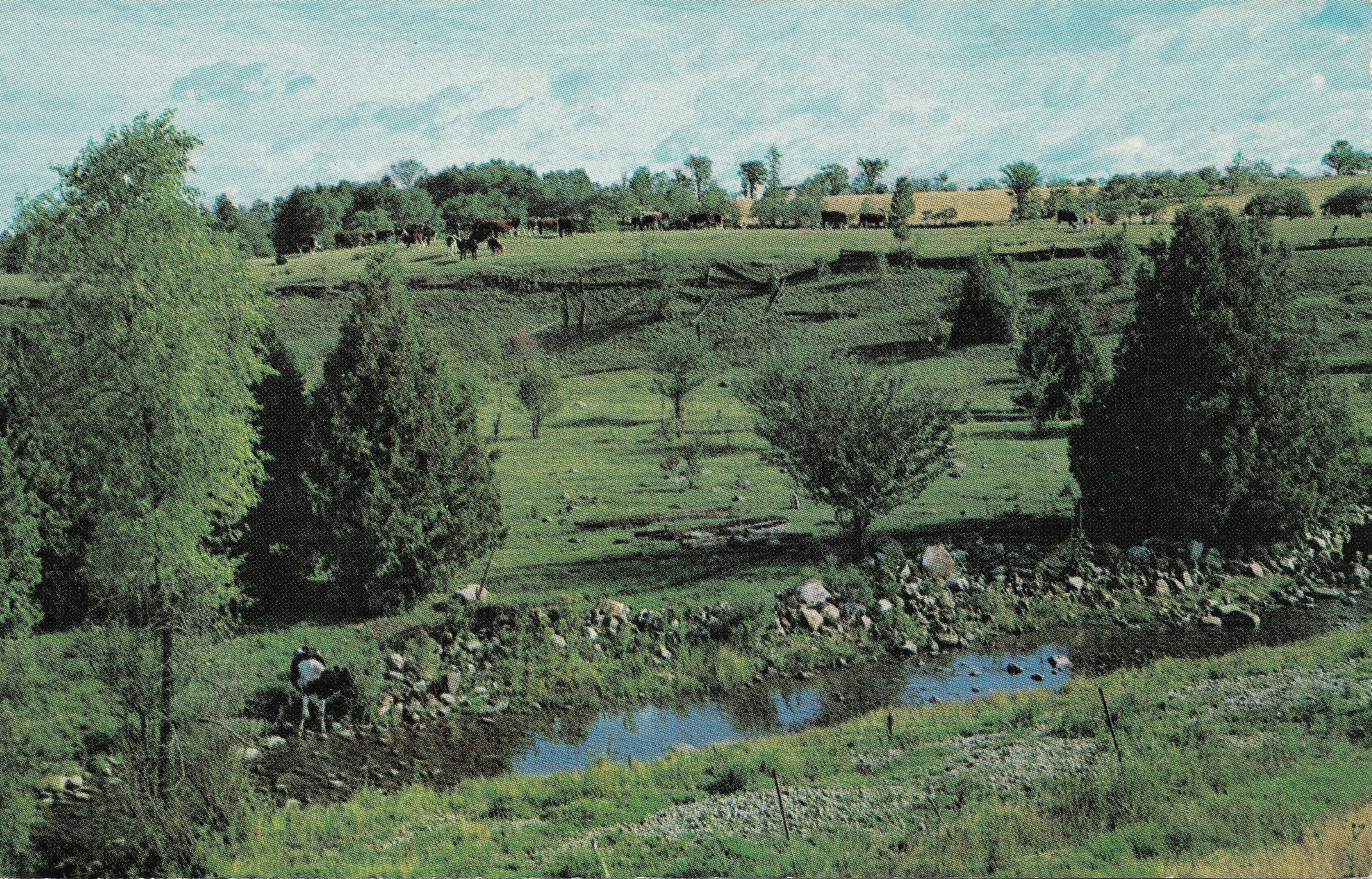 A postcard of Bonsecours in Innisfil depicting a stream running through a grassy area dotted with trees. Bonsecours Beach is located just north of Innisfil Beach Park.