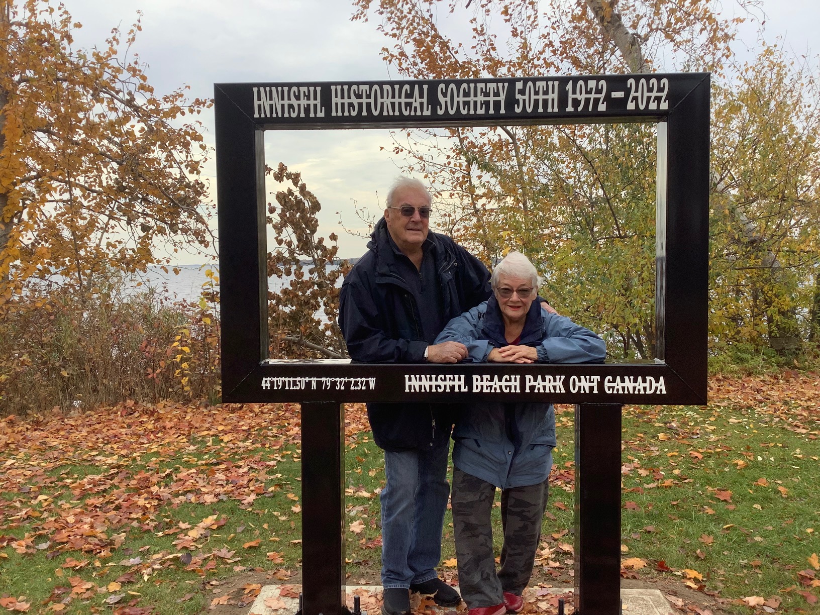 Photo of Ron and Marj Mossman standing inside a specially designed life-sized photo frame installed in Innisfil Beach Park to commemorate the 50th anniversary of the Innisfil Historical Society. The frame reads: "Innisfil Historical Society 50th 1972-2022" at the top, and the text at the bottom of "44.19.11.50 N 79.32.2.32 W Innisfil Beach Park Ont Canada" indicates the latitude, longitude, and the location. As described by the Society: "As a permanent reminder of the Innisfil Historical Society’s accomplishments over its 50 years, a stainless-steel picture frame has been installed on a busy shoreline in Innisfil Beach Park, with its backdrop view of Lake Simcoe. We hope that this art project will cause residents and visitors alike to pause and earmark their visit to the park with a family photo."