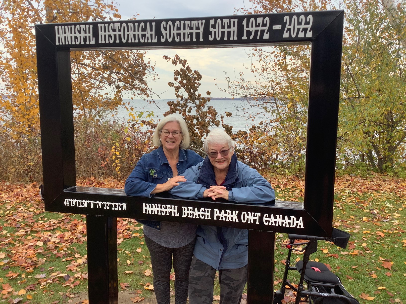 Photo of Donna Wice and Marj Mossman standing inside a specially designed life-sized photo frame installed in Innisfil Beach Park to commemorate the 50th anniversary of the Innisfil Historical Society. The frame reads: "Innisfil Historical Society 50th 1972-2022" at the top, and the text at the bottom of "44.19.11.50 N 79.32.2.32 W Innisfil Beach Park Ont Canada" indicates the latitude, longitude, and the location. As described by the Society: "As a permanent reminder of the Innisfil Historical Society’s accomplishments over its 50 years, a stainless-steel picture frame has been installed on a busy shoreline in Innisfil Beach Park, with its backdrop view of Lake Simcoe. We hope that this art project will cause residents and visitors alike to pause and earmark their visit to the park with a family photo."