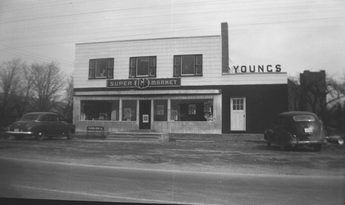 Photo of the front of Young's Store in Stroud after it became part of the IGA Supermarket chain in the early 1950s. The signage reads "Super IGA Market" with "Young's" to the right.