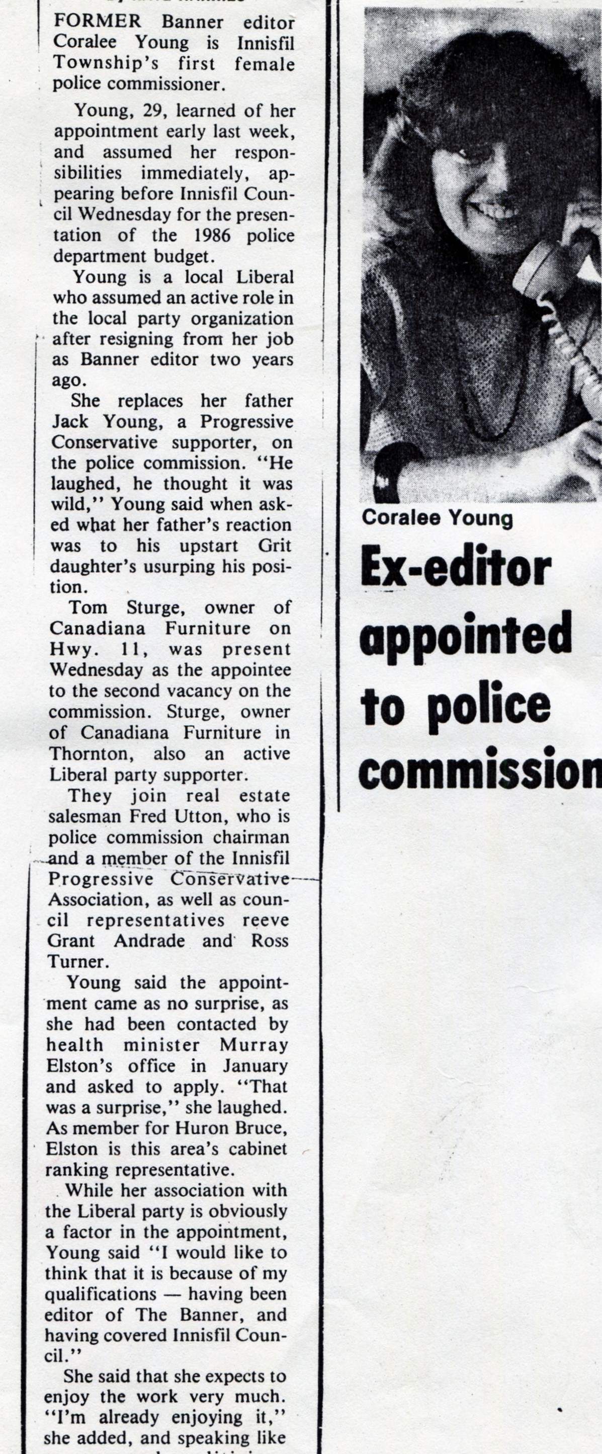 Newspaper clipping titled "Ex-editor appointed to police commission" detailing how Coralee Young replaced her father as Innisfil Police Commissioner to become Innisfil's first female police commissioner in 1986 at age 29. The article was written by Kate Harries and features a photo of Coralee holding a telephone receiver.