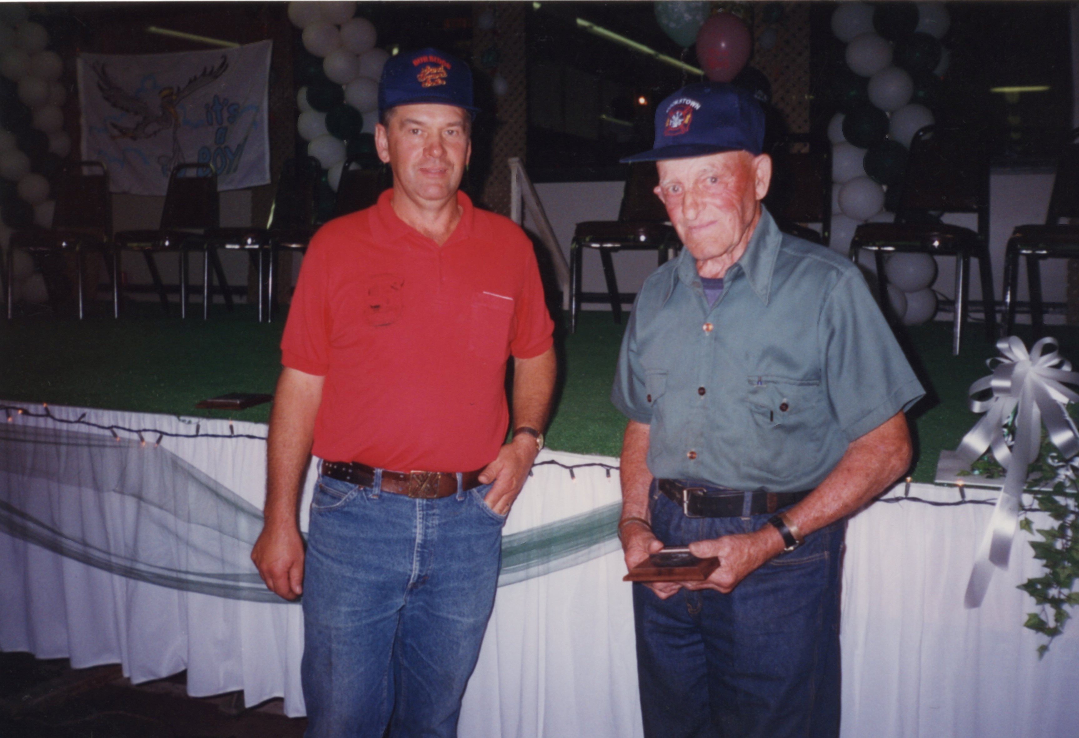 Image of Bill Marling (right) holding his award for long time service to the Cookstown Agricultural Fair. Bill is wearing a blue/grey button-up shirt tucked into blue jeans with a black belt. He is wearing a blue baseball cap that says "COOKSTOWN" above a fire fighting logo. He is accompanied by a man on the left, his son Dave Marling, who is wearing a red polo shirt tucked into jeans with a brown belt, and a blue baseball hat with a red and yellow logo on. The two men stand in front of a stage.