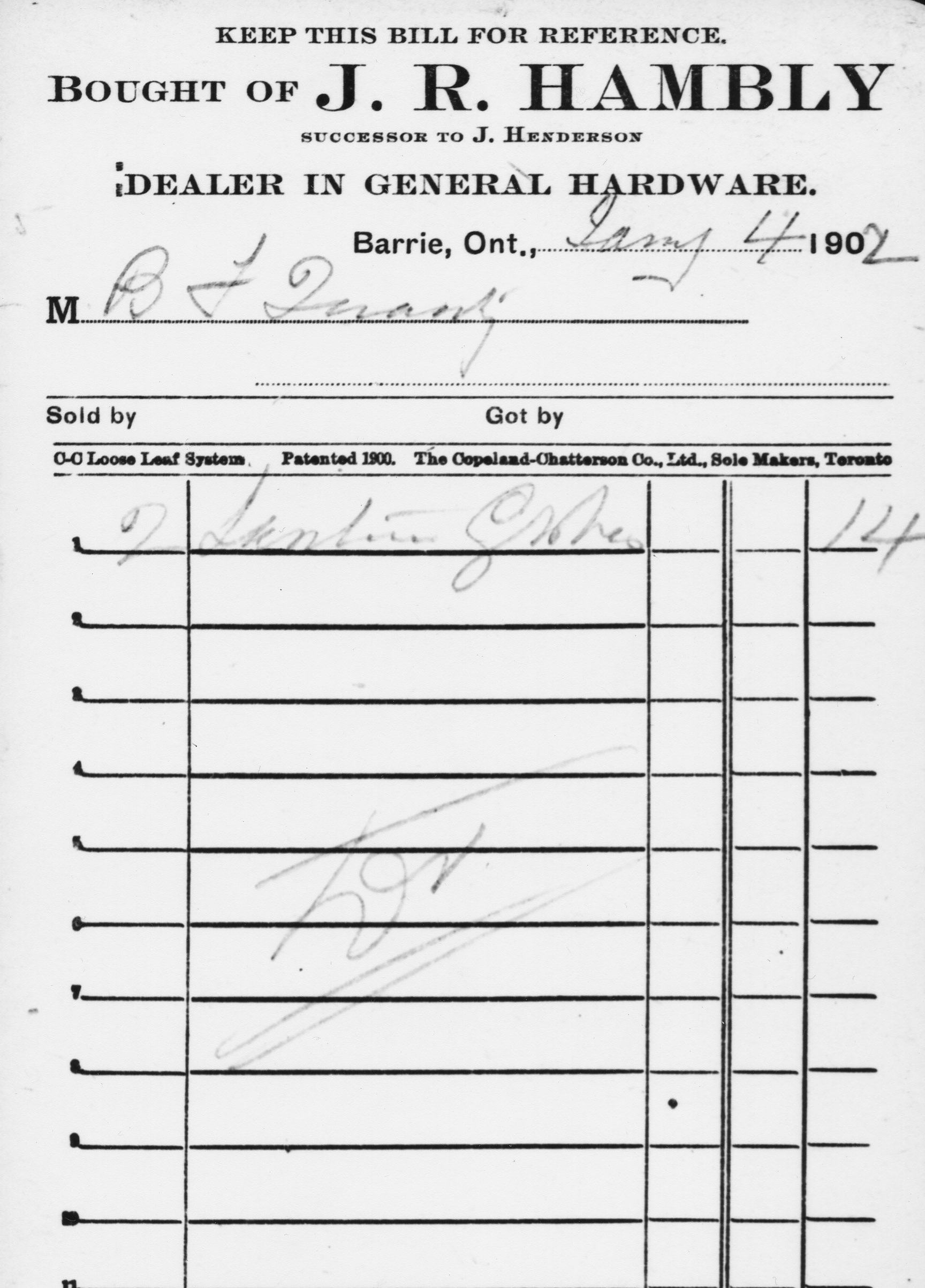 Bill from J. R. Hambly (General Hardware, Barrie) to B. F. Quantz, Innisfil for 2 Lantern Globes - 14 cents