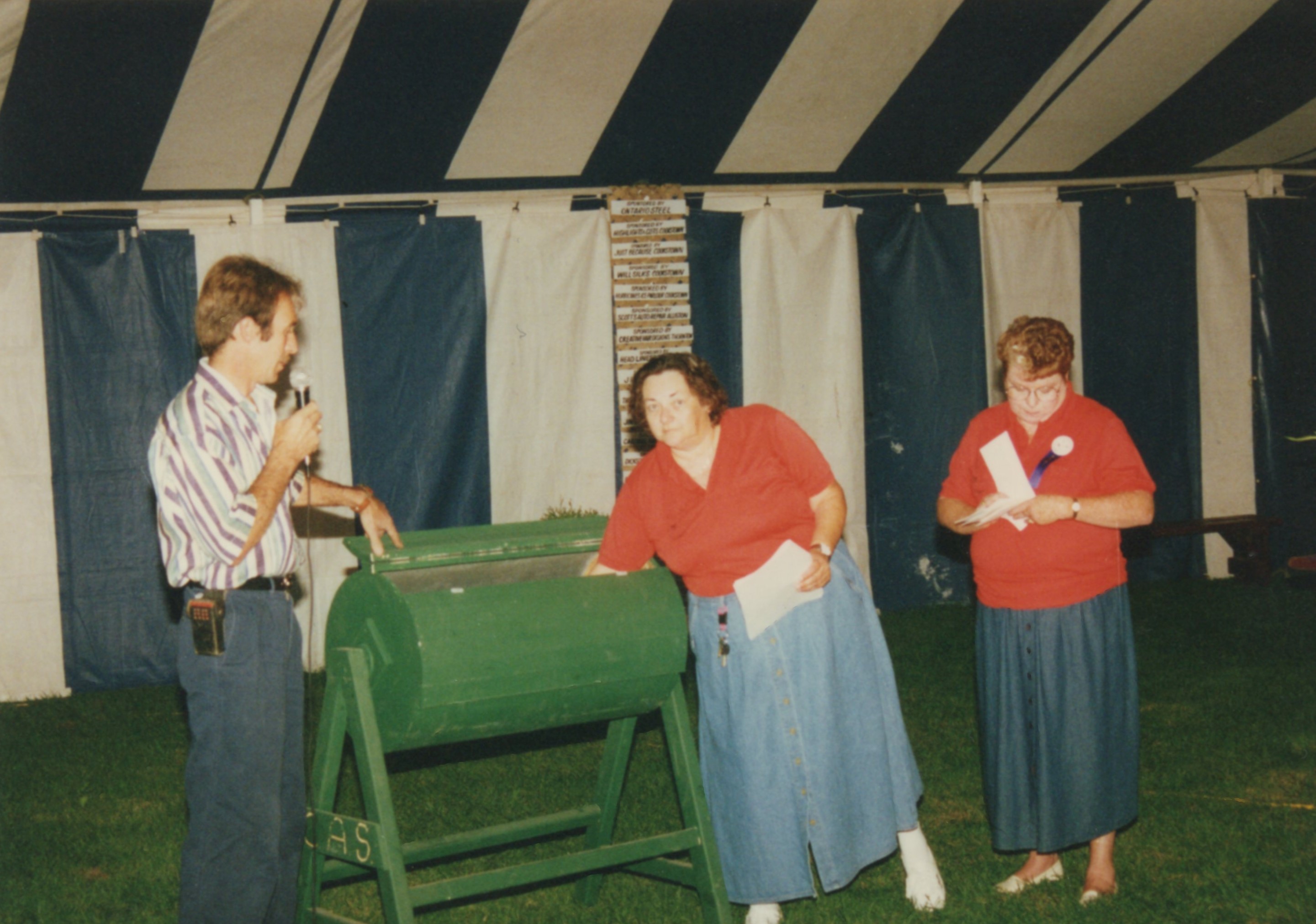 Image of a raffle ticket being drawn from inside a green barrel at the Cookstown Agricultural Fair. The barrel is made out of wood and has been painted green. The man standing on the left of the barrel is holding a microphone and wearing a striped shirt and jeans. There are two women standing on the right of the image, with one leaning into the barrel to select the winning raffle ticket. Both are wearing red polo shirts with long denim skirts. The raffle selection is taking place inside a blue and white striped tent.
