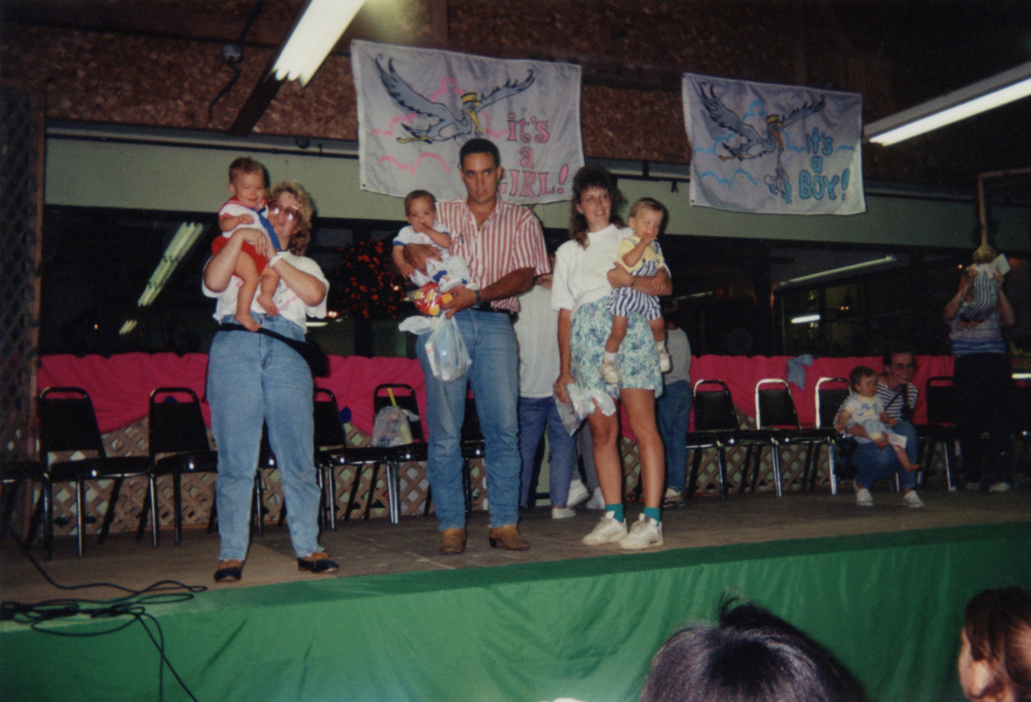 Stage view of the 1992 Baby contest at Cookstown Agricultural fair. The are three adults at the front of the stage holding the babies they are accompanying for the contest. Above the stage are two signs, one says "it's a GIRL!" in pink writing with a stalk, and the other says "it's a BOY!" in blue writing with a stalk.