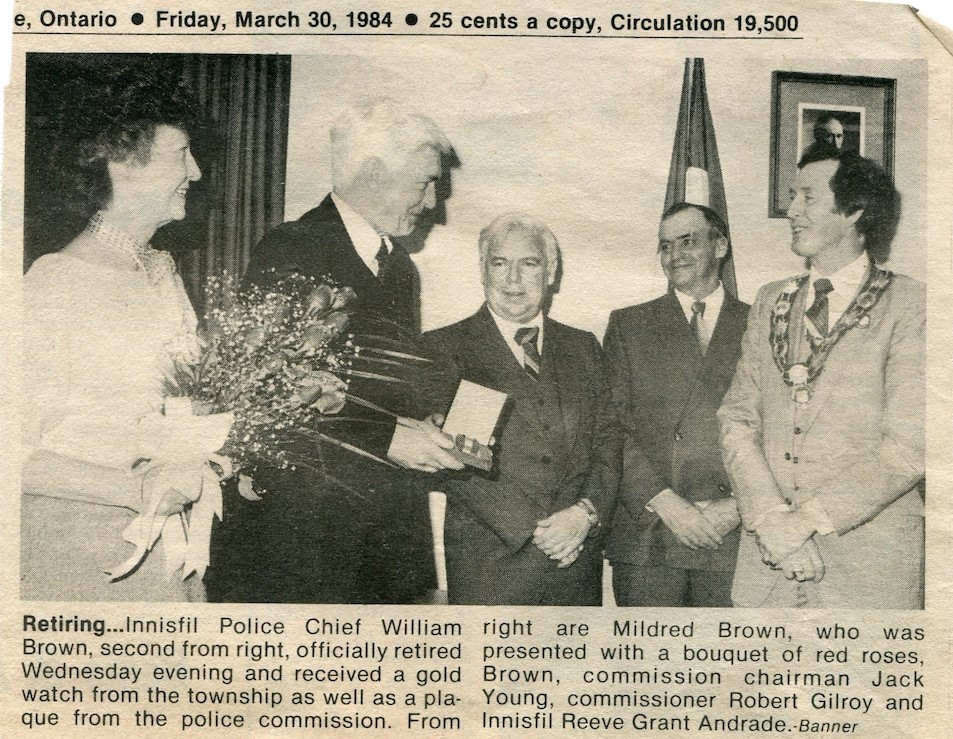 Newspaper clipping from Friday 30 March 1984 announcing the retirement of William Brown, Innisfil Police Chief, featuring a photo with the following caption: "Retiring… Innisfil Police Chief William Brown, second from right, officially retired Wednesday evening and received a gold watch from the township as well as a plaque from the police commission. From right are Mildred Brown, who was presented with a bouquet of red roses, Brown, commission chairman Jack Young, commissioner Robert Gilroy, and Innisfil Reeve Grant Andrade. -Banner"