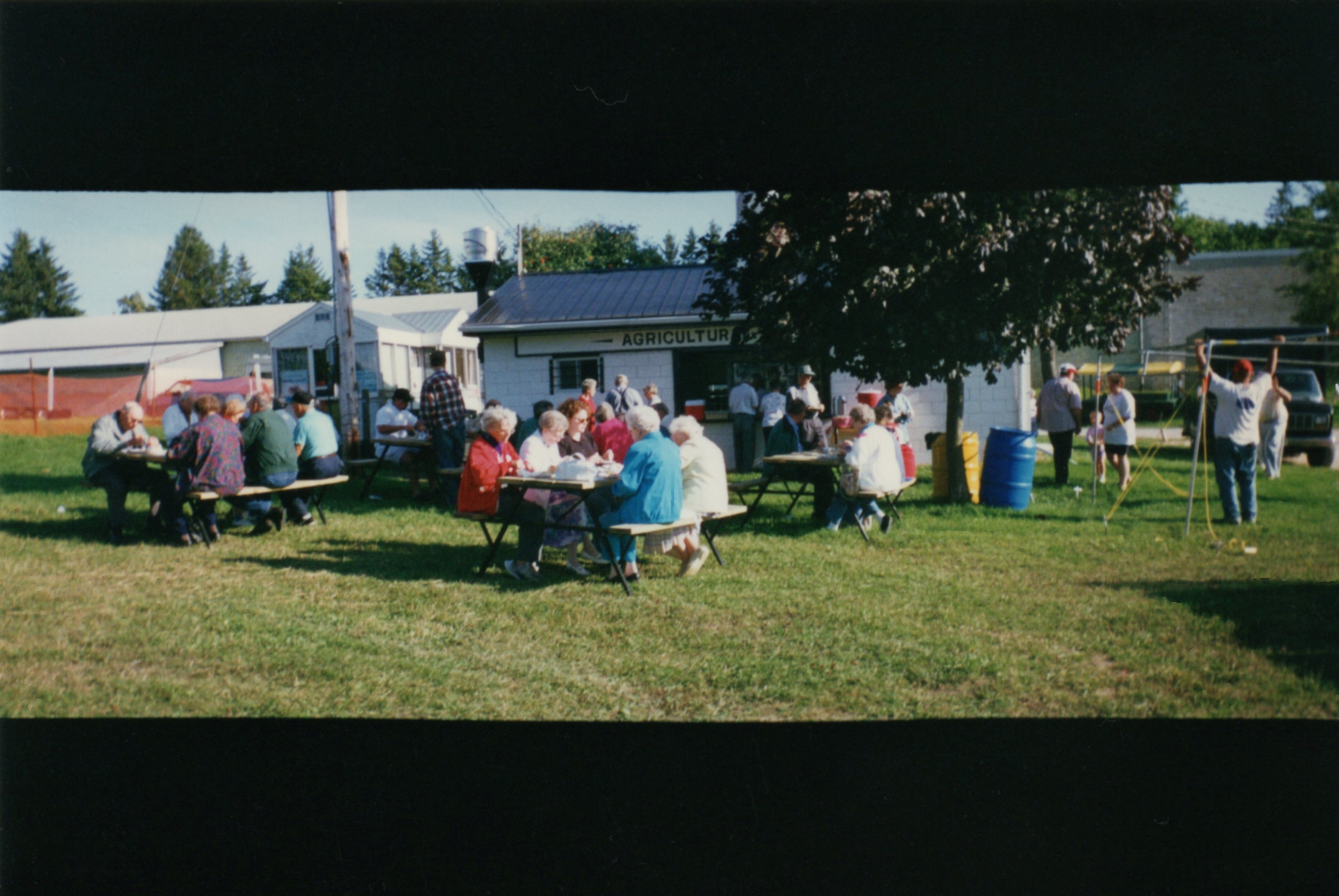 Image of five filled picnic tables on the Cookstown Fairgrounds. The tables are situated in front of the "Agriculture Snack Bar".