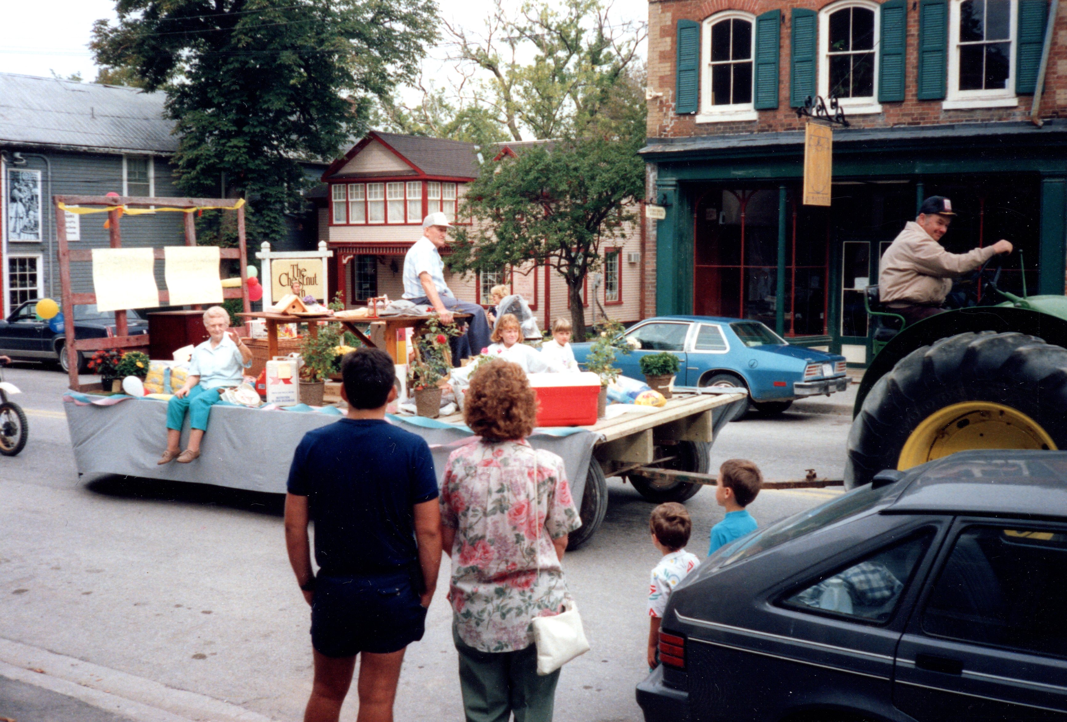 A 1997 Agricultural Society parade float traveling through Queen Street in Cookstown. The float is being pulled by a tractor. Two children and two adults sit on the float with a cooler box, plants, and some woodworks such as birdhouses. A sign for the Chestnut Inn is visible in the background. The parade took place as part of the 130th Fall Fair.