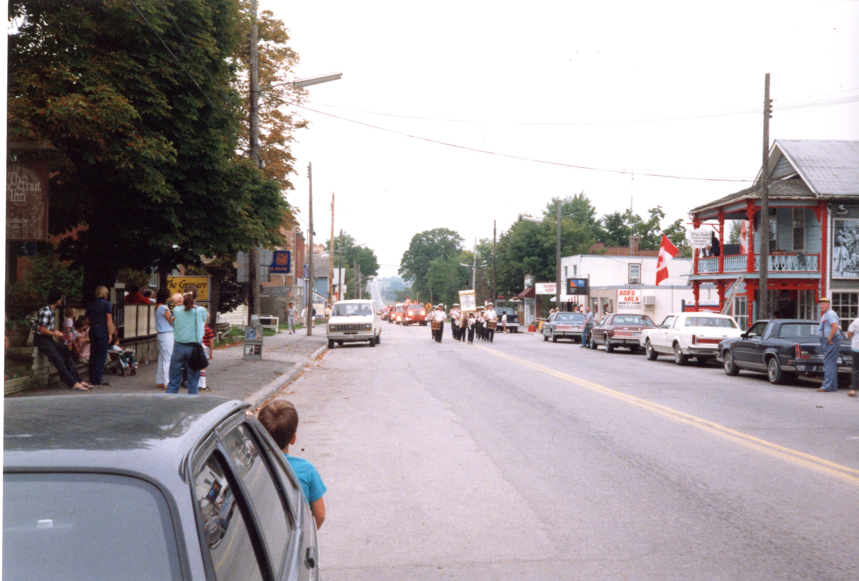 Image of Queen Street in Cookstown, where a parade can be seen traveling towards to camera. There seems to be a marching band at the front of the parade line, followed by firetrucks. A number of Cookstown shops and businesses are visible. The parade took place as part of the 130th Fall Fair.